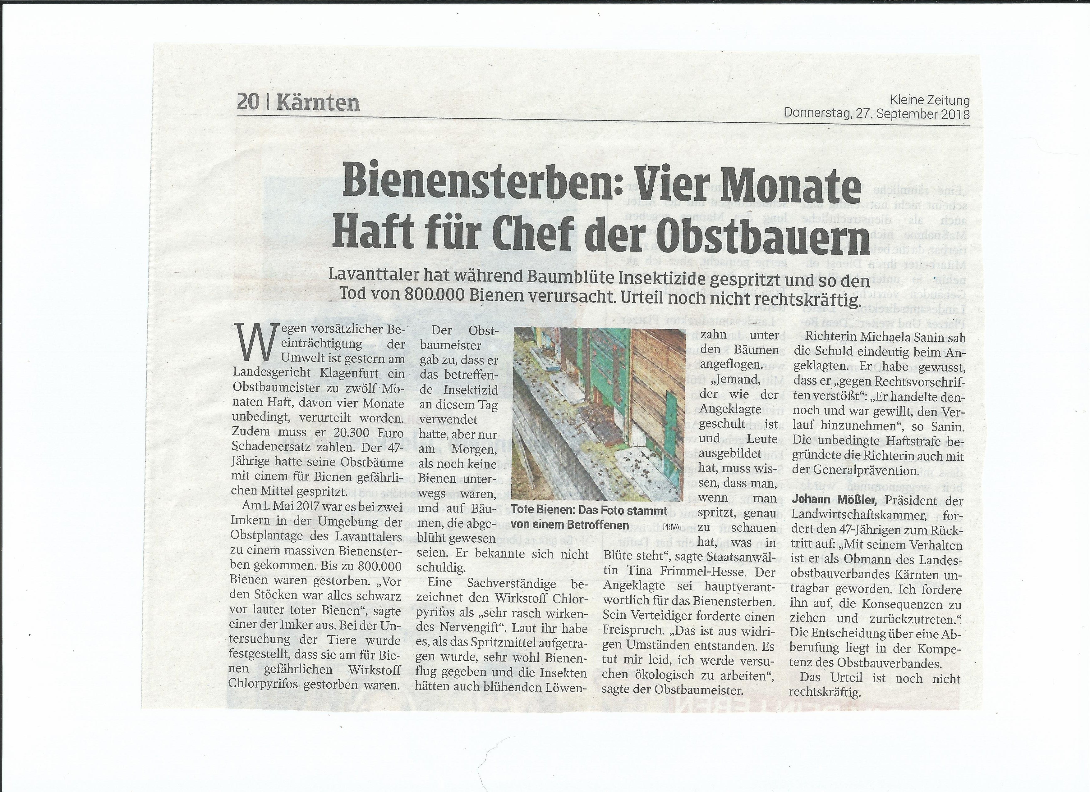 Bevor ich es vergesse: Der zu Strafzahlungen und Gefängnis (nicht rechtskräftig) verurteilte Obmann des Erwerbsobstvereins im Kärntner Lavanttal, der unmittelbar für den Tod von 800.000 Bienen verantwortlich ist und jahrelang von der öffentlichen Hand geförderte Aktionen zum Thema "gesundes Obst an unseren Schulen" durchgeführt hat, ist wieder zum Obmann gewählt worden. Das glaubt niemand? Doch es stimmt, so geht Politik bei uns! Es lebe die Natur........