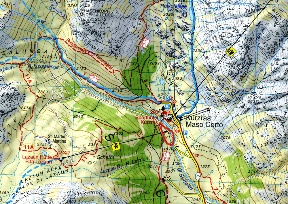 Im Ausschnitt einer alten Tabacco-Karte (Berichtigungsstand 1986) habe ich den Bereich dick rot umrandet. Anhand dieser Karte hatten wir uns 1991 auf der Exkursion orientiert. GPS und Google Earth gab's da noch nicht. - Inzwischen hat sich das Wintersportgebiet erheblich vergrößert, mehr Lifte und Pisten wurden angelegt.