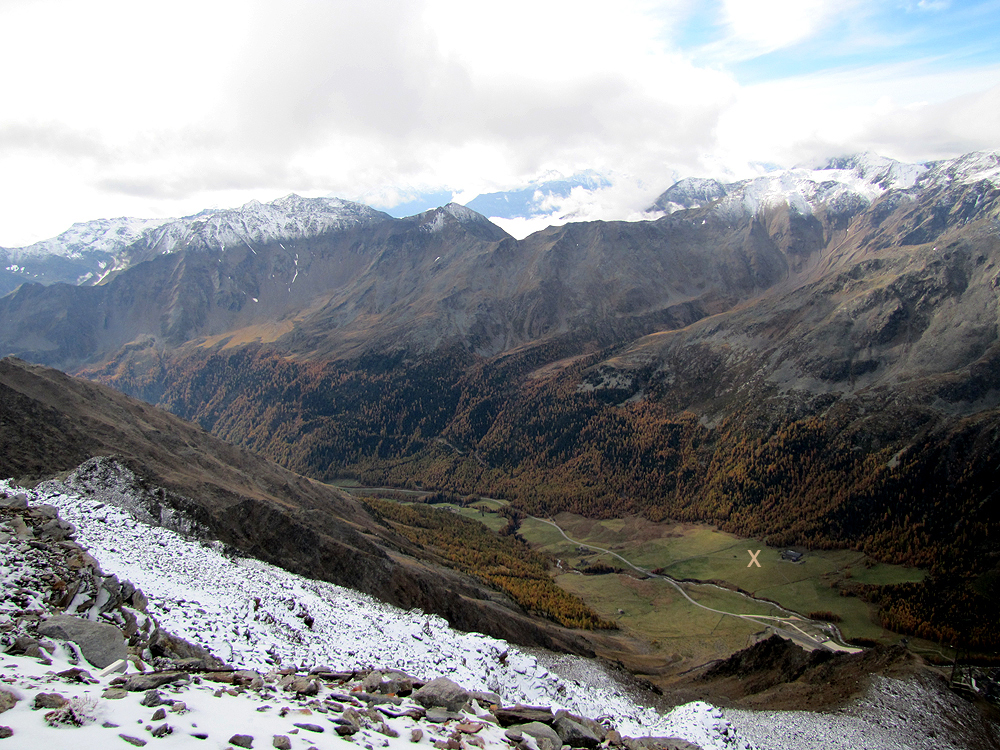 Am 15. Oktober 2014 war ich während einer Urlaubsreise nochmals in Kurzras. Bei der Fahrt mit der Grawand-Gondelbahn habe ich dieses Bild aufgenommen (in der Karte ist es die Bahn von Kurzras zur rechten oberen Ecke). Das Nest sollte sich in dem Wiesenbereich unterhalb des Waldes ungefähr bei dem hellen X im Bild befunden haben. Kurzras liegt hier verdeckt in der rechten unteren Bildecke.