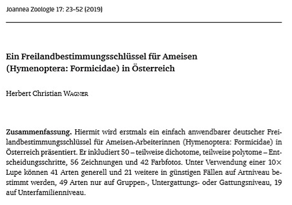Herbert Christian Wagner hat einen bebilderten Bestimmungsschlüssel für die Ameisen Österreichs in deutscher Sprache veröffentlicht.