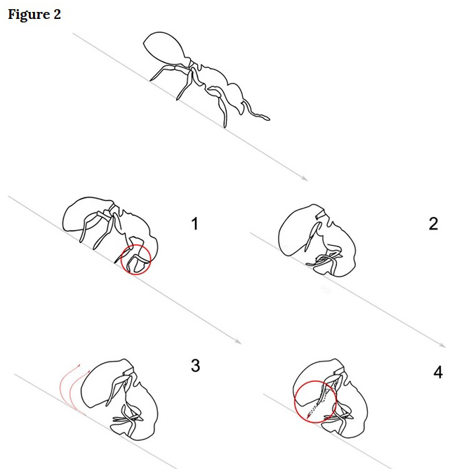Oben: Normal laufende Ameise. 1: Antennen und Mandibeln werden zur Vorbereitung des Rollens aufgestützt. 2: Kopf und Gasterspitze werden aufeinander zu bewegt, die Beine werden angezogen. 3: Die Ameise beginnt zu rollen. 4: Die Hinterbeine können ausgestreckt werden um die Ameise weiter voranzutreiben.