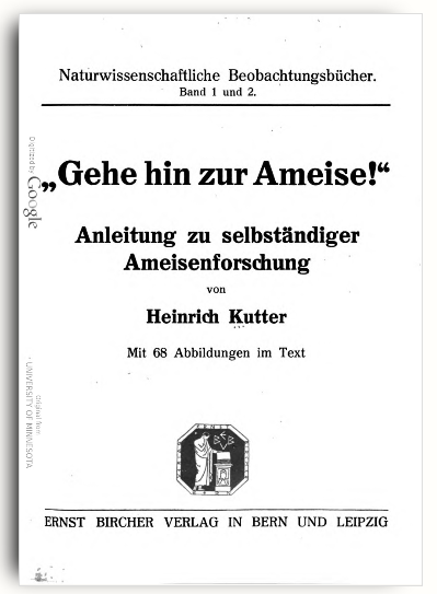 Kutter, H., 1920, “”Gehe hin zur Ameise!” Anleitung zur selbständigen Ameisenforschung.” Naturwissenschaftliche Beobachtungsbücher 1-2: viii + 165 pp.