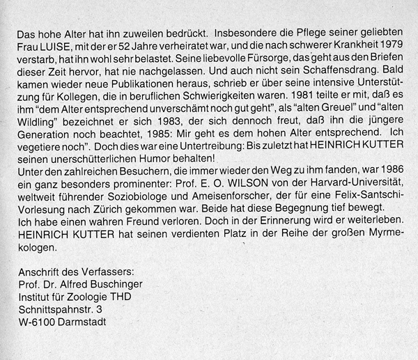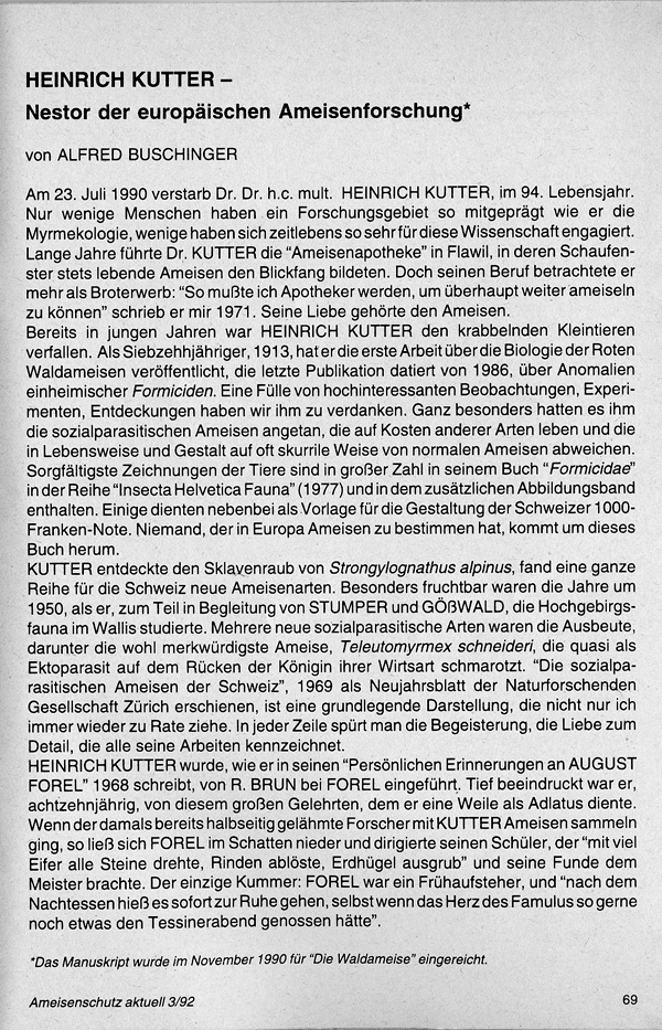 Es passt vielleicht gut hier herein: In der Zeitschrift der Dt. Ameisenschutzwarte hatte ich 1992 einen Nachruf auf den 1990 verstorbenen Heinrich Kutter verfasst.
