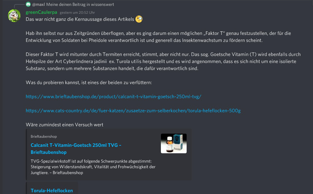 So hat da jemand im AAM-Server doch tatsächlich eine uralte Veröffentlichung von Wilhelm Goetsch ausgegraben (um 1950), über ein angebliches „Vitamin T“ (aus/von Termiten). Es soll die Produktion von Termiten-Soldaten fördern und sogar bei Ameisen (Pheidole sp.) wirken.