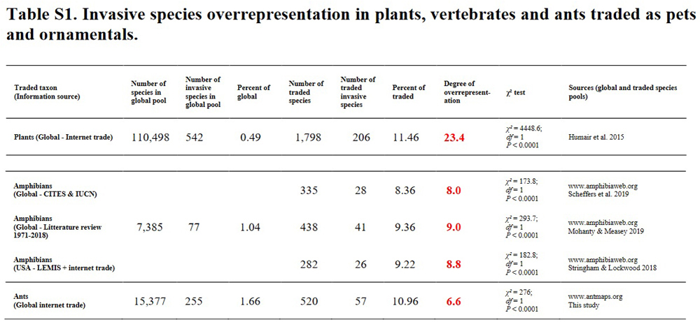 In Rot: Grad der Über-Repräsentation invasiver unter den gehandelten, bei Ameisen also 6,6 - Im Vergleich dazu bei Amphibien 8 – 9; bei Pflanzen (ganz oben) 23,4.