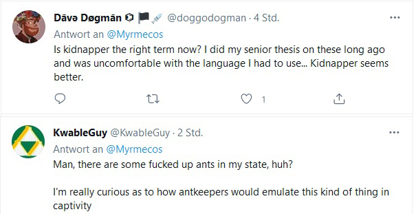 Einer, der anscheinend früher über Sklavenhalter-Ameisen gearbeitet hat, fragt, ob „Kidnapper“ jetzt die richtige Bezeichnung sei; er findet es besser. - Doch gibt es bei solchen Benennungen kein „richtig“ oder „falsch“. Es wird sich zeigen, ob die Mehrheit der Myrmekologen einen der alternativen Begriffe annimmt. Vielleicht sollte man den ebenfalls alten Begriff „Duloten“ weiterhin beibehalten. Das heißt zwar dasselbe wie Sklavenhalter, wird aber wohl von der Mehrheit der Laien nicht verstanden. Dann muss man sich nicht darüber aufregen, und man muss "kidnapper" bzw. "pirate ants" nicht in alle anderen Sprachen übersetzen.