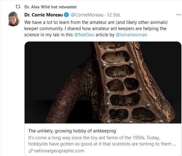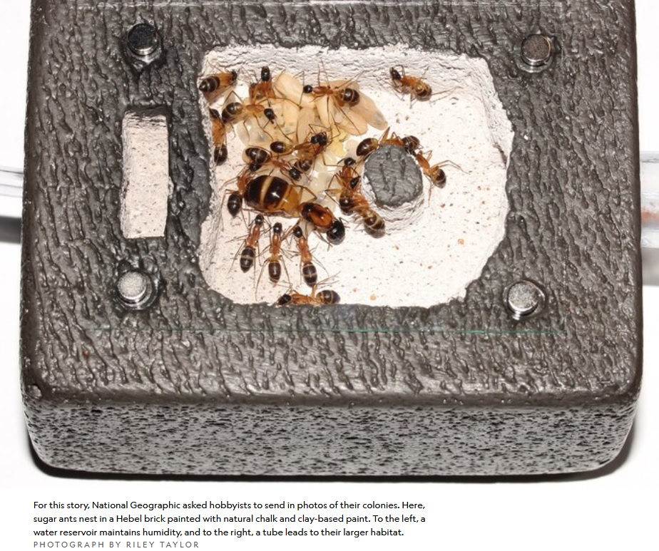 Der Artikel im National Geographic vom 24. Mai 2021, The unlikely rise of antkeeping (Der unwahrscheinliche Aufstieg der Ameisenhaltung), will aufzeigen, wie die Wissenschaft von Techniken der Hobby-Ameisenhalter lernen kann, ihre Versuchstiere besser und erfolgreicher zu halten. Der Beitrag enthält schöne, technisch perfekte Bilder von Ameisen und Formikarien, z. B. dieses: