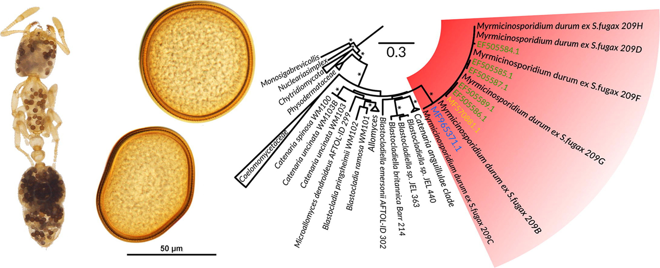 Lösung eines alten Rätsels: Myrmicinosporidium durum gehört zu den Blastocladiomycota, einem Stamm primär aquatischer Pilze.