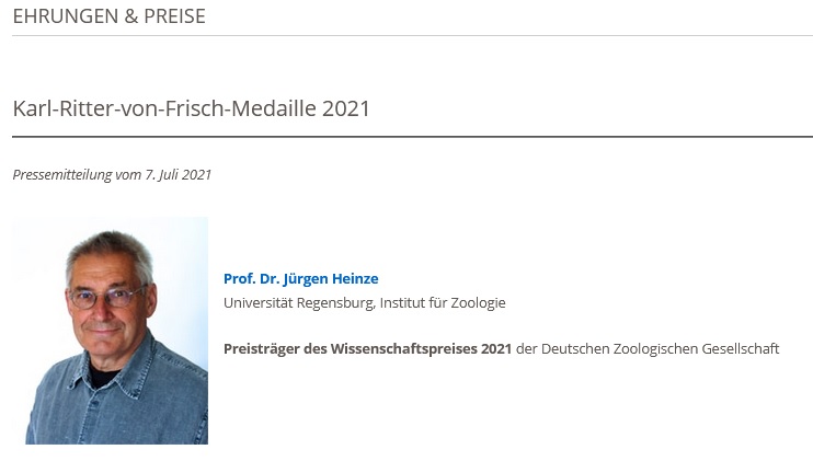 Prof. Dr. Jürgen Heinze, Uni Regensburg, erhält am 30. August 2021 die Karl-Ritter-von-Frisch-Medaille der Deutschen Zoologischen Gesellschaft (DZG).