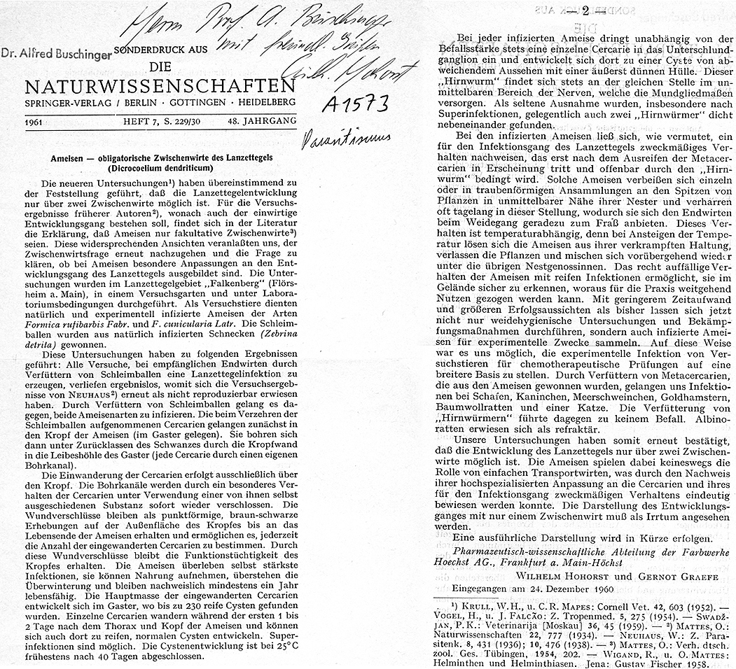 Wilhelm Hohorst, Gernot Graefe (1961): Ameisen – obligatorische Zwischenwirte des Lanzettegels (Dicrocoelium dendriticum). Naturwissenschaften 48, S. 229–230.