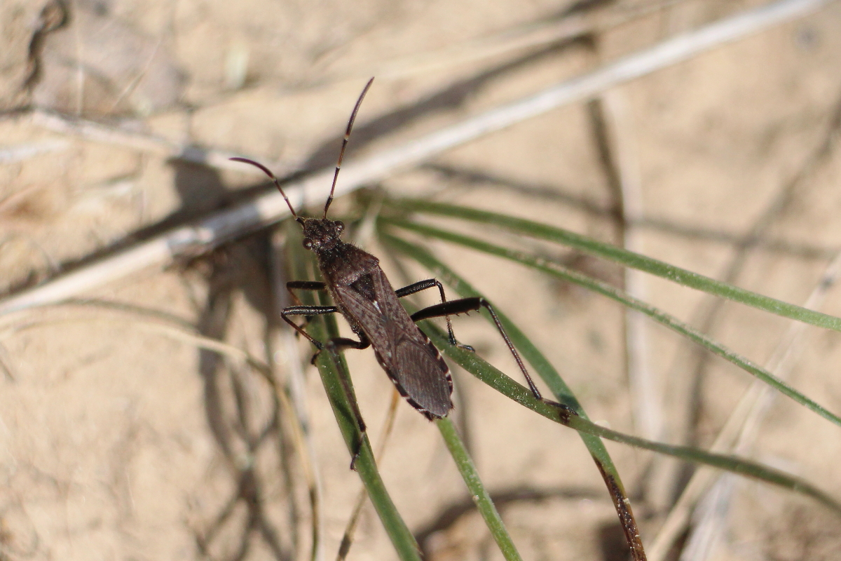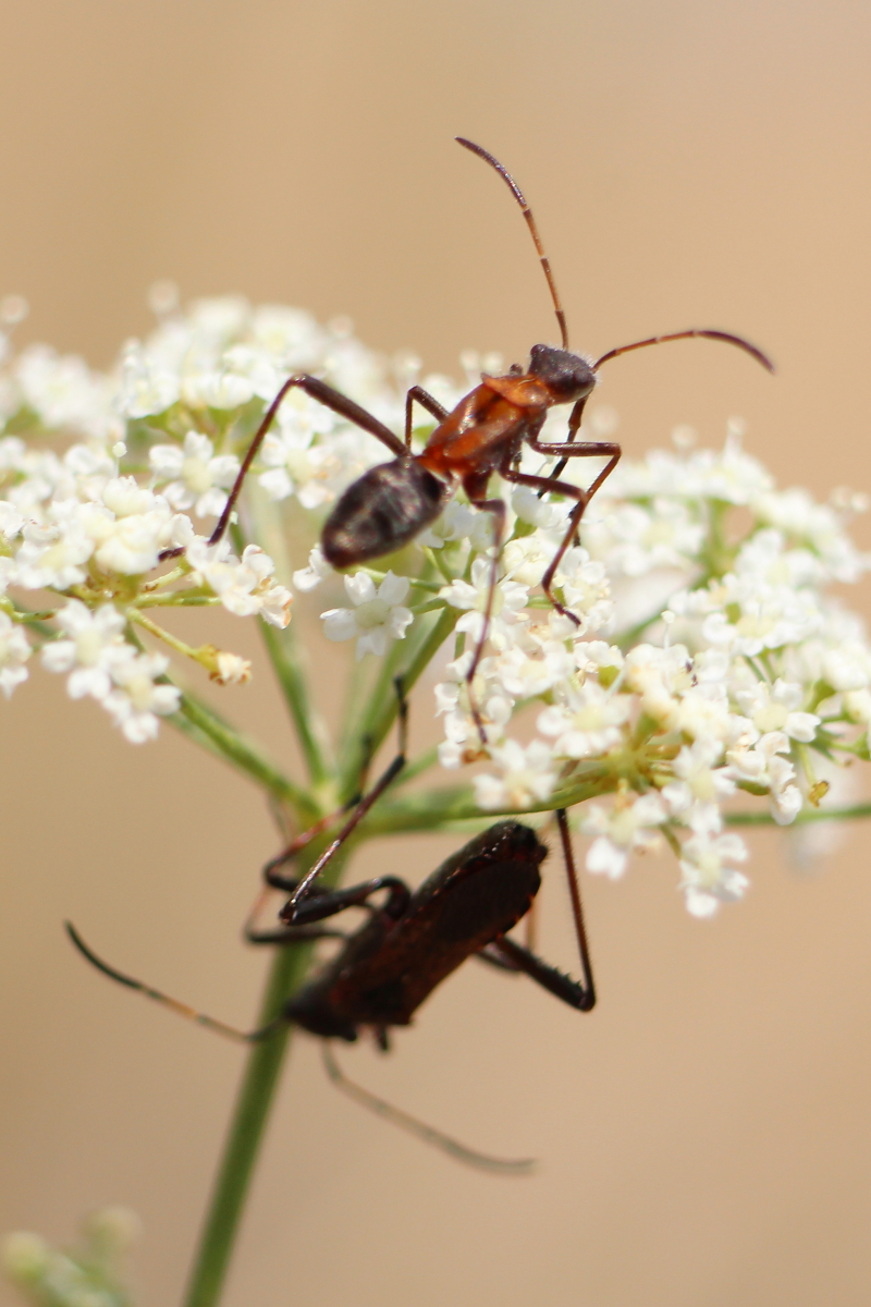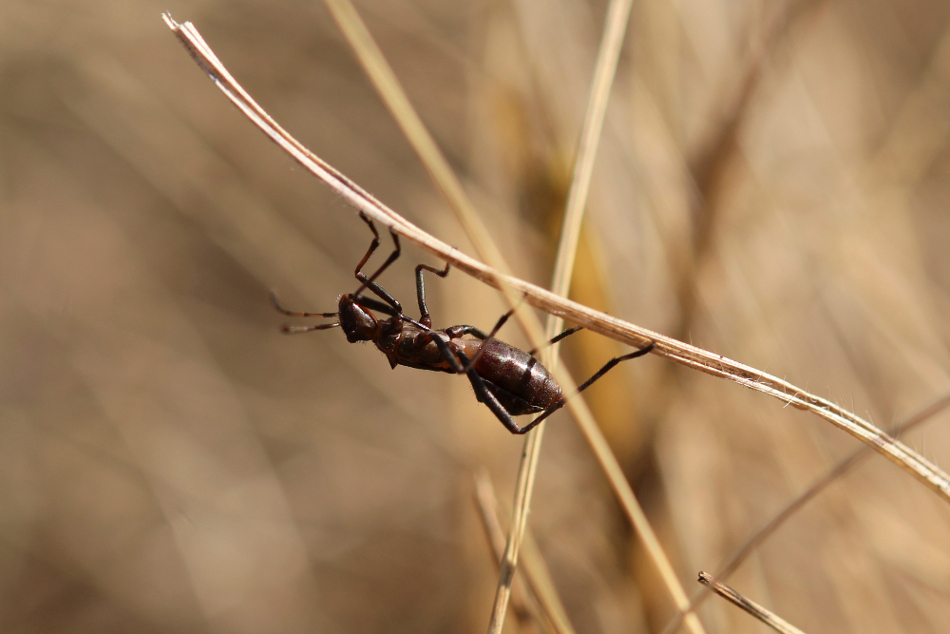 Auf einer Magerwiese, bin ich einer – wie sich später herausstellte – Nymphe von Alydus calcaratus begegnet. Die erwachsenen Tiere der Art sind schlanke, schwarze Wanzen, ihr Kopf ist nicht breiter als das Pronotum, bei den Männchen verlaufen die Vorderflügel und das Abdomen beinahe parallell, bei den Weibchen ist der Hinterleib etwas breiter und überragt die Flügel seitlich, wobei die schwarz-weisse Musterung am Rand sichtbar wird. Diese kann den Eindruck erwecken, das Tier hätte einen schwarz-weiss gestreiften Hinterleib, bei geöffneten Flügeln wird aber ein leuchtend oranger Fleck in der Mitte sichtbar. Soweit so unspektakulär.