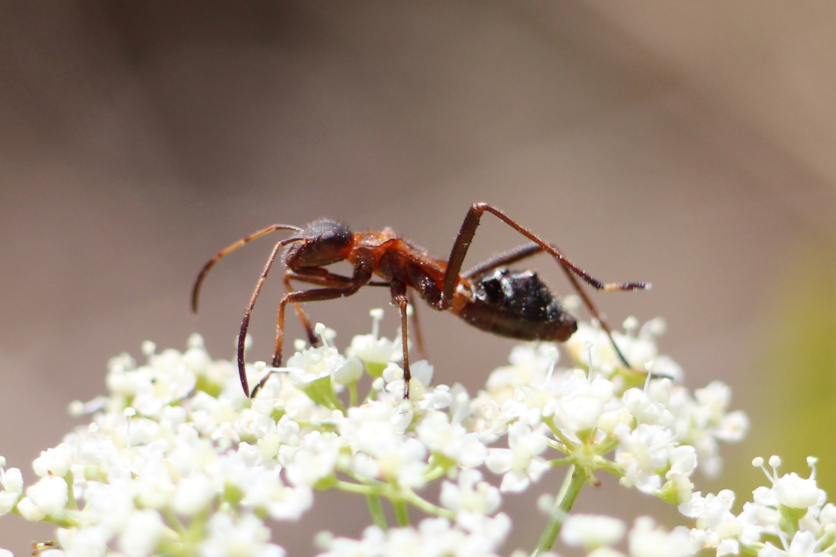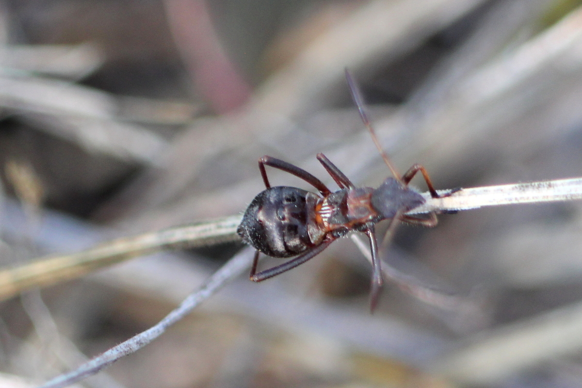 Die Mimikry ist so überzeugend, dass mir bei meiner Feldbeobachtung eines Formica cf. rufibarbis Nestes erst auf den zweiten Blick aufgefallen ist, dass "etwas mit dieser Ameise nicht stimmt", die da neben dem Nestausgag auf einen Halm kletterte. Erst als ich das Tier genau in den Fokus nahm, wurde mir klar, dass ich es gar nicht mit einer Ameise zu tun hatte. Nicht nur Form und Farbe, sondern auch die Bewegungen der Ameisen werden nachgeahmt! Der wanzentypische Rüssel klappt das Tier ein und verbirgt ihn eng am Unterleib.