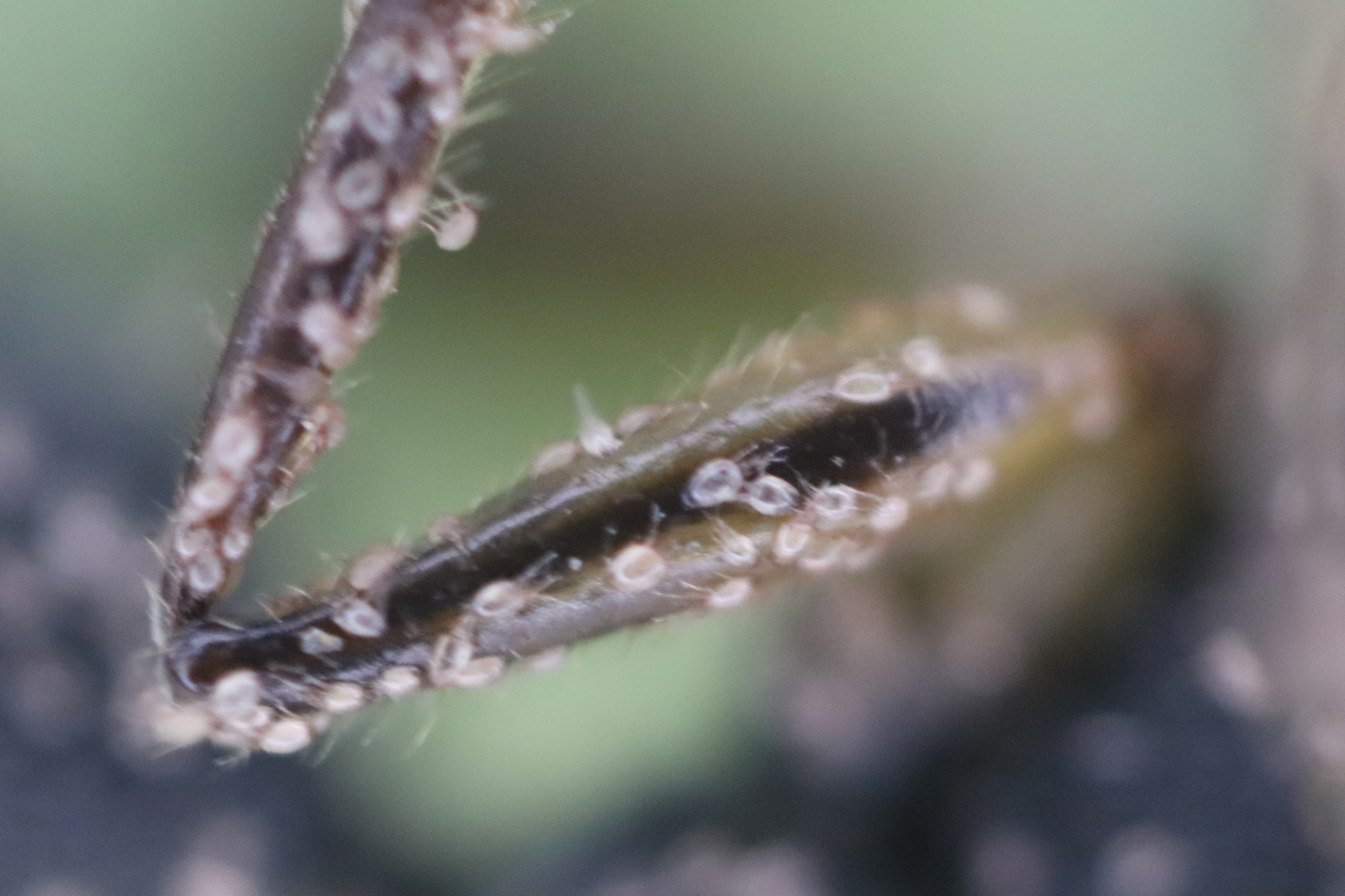 Oft gibt es aber keinen Grund zur Sorge, dann nämlich, wenn es sich bei den kleinen hellen Insekten um Staubläuse (Psocoptera) oder Springschwänze (Collembola) handelt. Im Unterschied zu den meist noch kleineren Milben, bewegen sie sich eher schnell fort. Sie sind zwar oft am Futter zu sehen, sitzen aber nie auf den Ameisen selber. Kopf und/oder Antennen sind von blossem Auge zu erkennen.