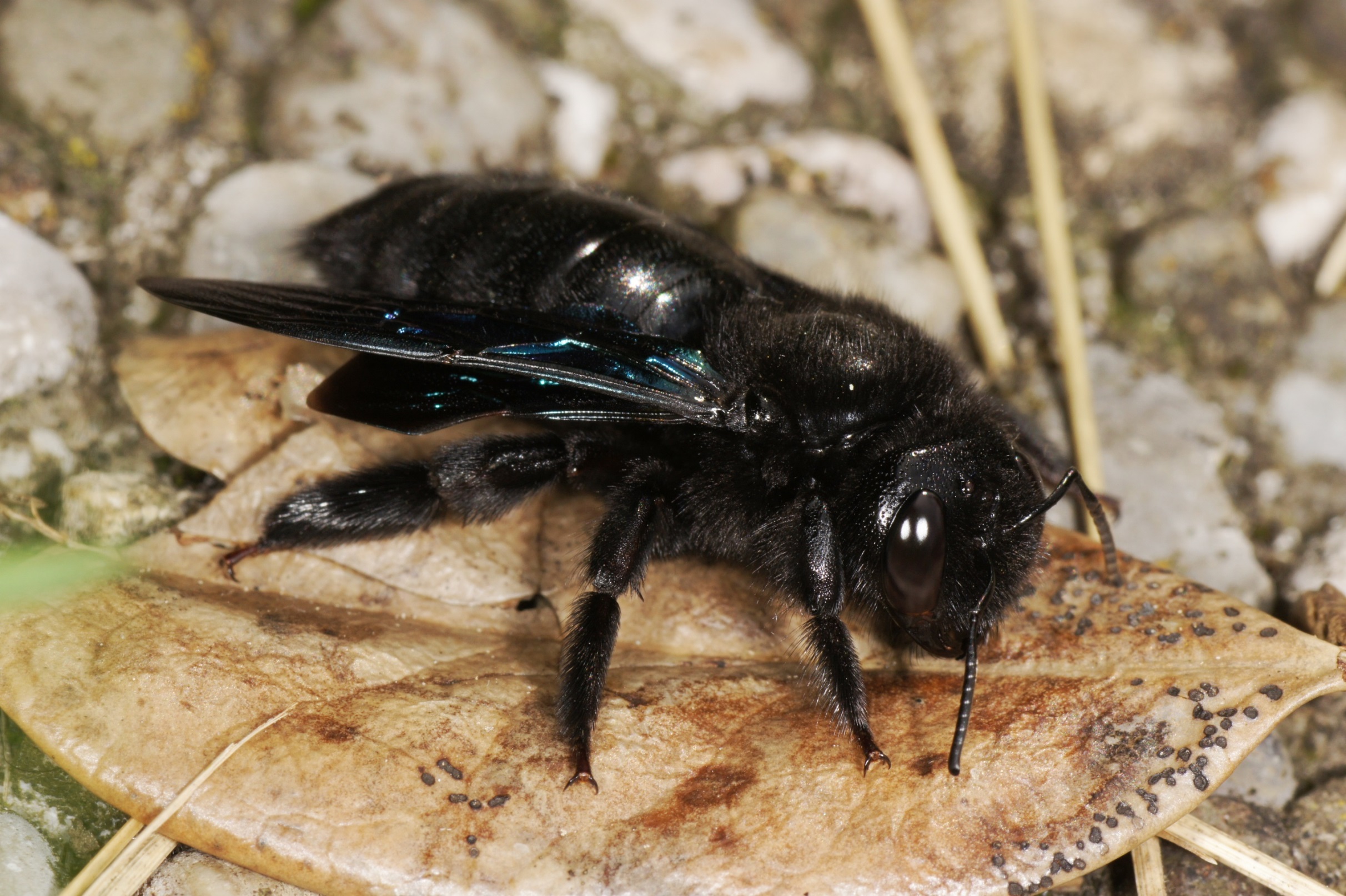 Über die imposanten Holzbienen hatte ich schon im alten AF 2011 berichtet, dort sind aber leider die Bilder verschwunden. Ich fand damals eine Holzbiene am Boden sitzend und ich dachte es gehe mit ihr zu Ende. Da diese Insekten hervorragende Flieger sind und auf die Annäherung des Menschen sofort mit Flucht reagieren, holte ich rasch meine Kamera. Es dürfte sich um Xylocopa violacea handeln, zu verwechseln wäre sie mit Xylocopa valga. Eine dritte Art kommt (bisher) in Mitteleuropa vor: Xylocopa iris, die angeblich von den beiden zuerst genannten Arten leichter zu unterscheiden ist. Die Insekten werden bis etwa 2 cm lang, hier handelt es sich um ein Weibchen.
