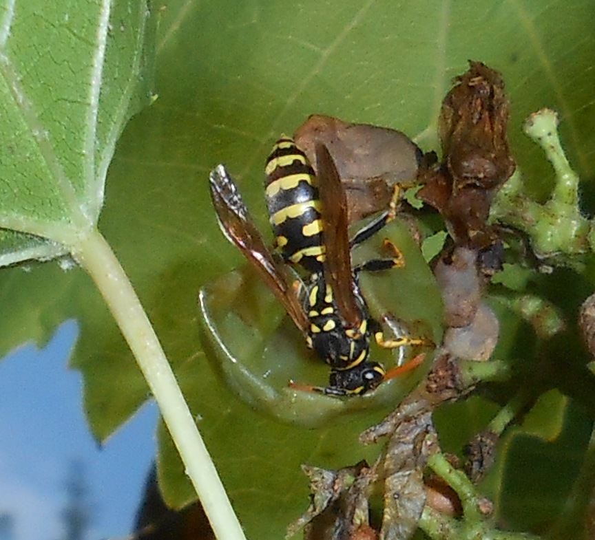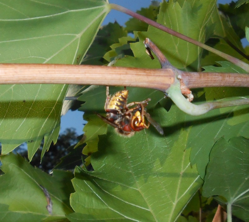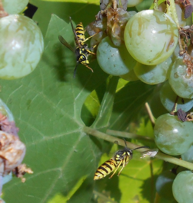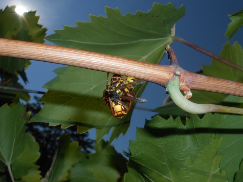 Tatsächlich waren dort mindestens zwei Wespenkolonien die sich im Streit über die Trauben bekämpften. Konnte sie äußerlich nicht auseinander halten, aber es sind immer wieder mal ein paar Wespen aufeinander gestoßen, die sich sofort bekämpft und nicht selten im Flug umschlungen gemeinsam abgestürzt sind, wobei dies selten tödlich endete und sich beide einfach wieder aufrappelten und weiter flogen.