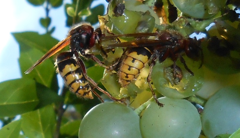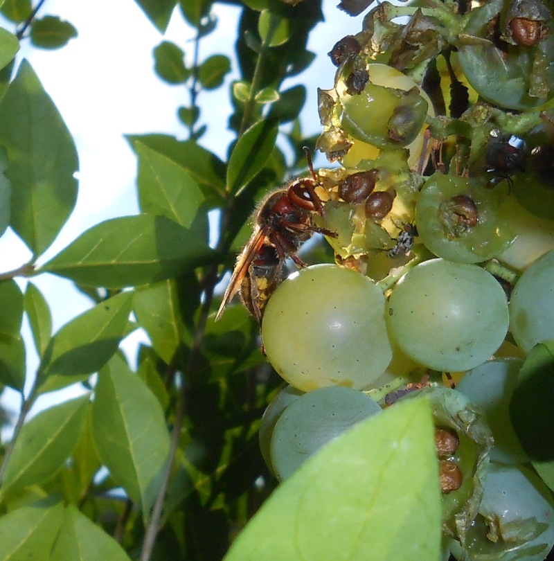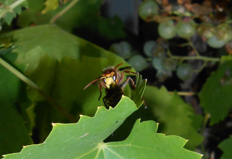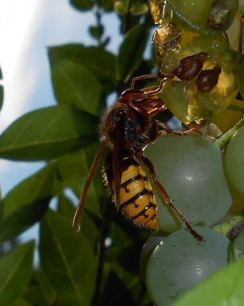 Zuerst sah ich sie ebenfalls nur, wie sie sich an den Trauben gütlich taten, aber als die erste kleinere Wespe ihr zu nahe kam, war schlagartig klar, dass der Traubensaft nur eine kleine Stärkung vor der Jagt war.