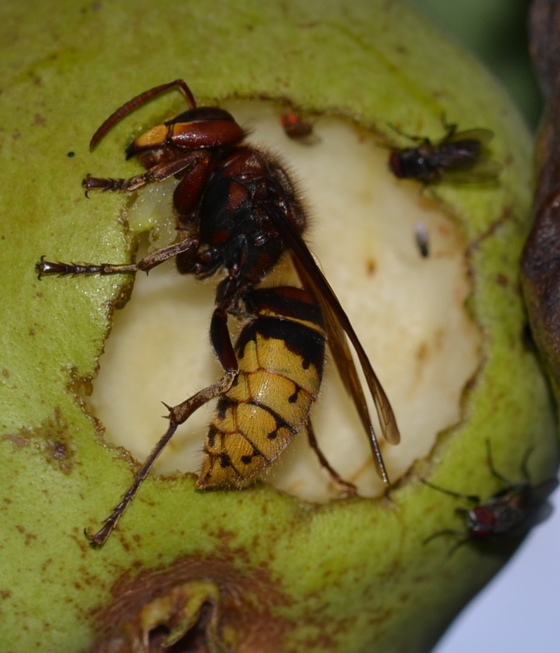 So schnell konnte ich oft gar nicht gucken, wie die ihre Opfer von hinten gepackt und getötet haben, also hatte ich immer nur den kleinen Augenblick, den die Hornisse braucht, um das Opfer einmal zu drehen und den Hinterleib abzutrennen, bevor sie damit Heim flog, weswegen ich leider nicht ein brauchbares Bild davon habe.