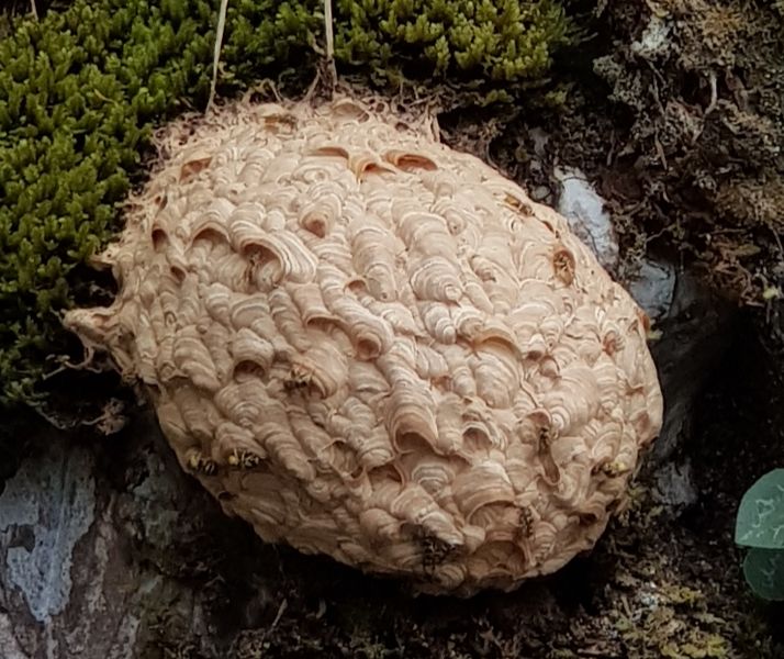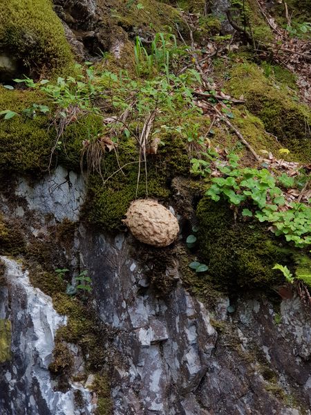 Oder hat eine Wespenkönigin in einem viel zu kleinen Hohlraum im Felsen mit dem Nestbau angefangen? Als dieser dann zu klein wurde, hat das Volk über den Stein herausgebaut? So etwas gibts (z.B. bei Vogelhäuschen), aber in dem Ausmass doch wohl nicht?