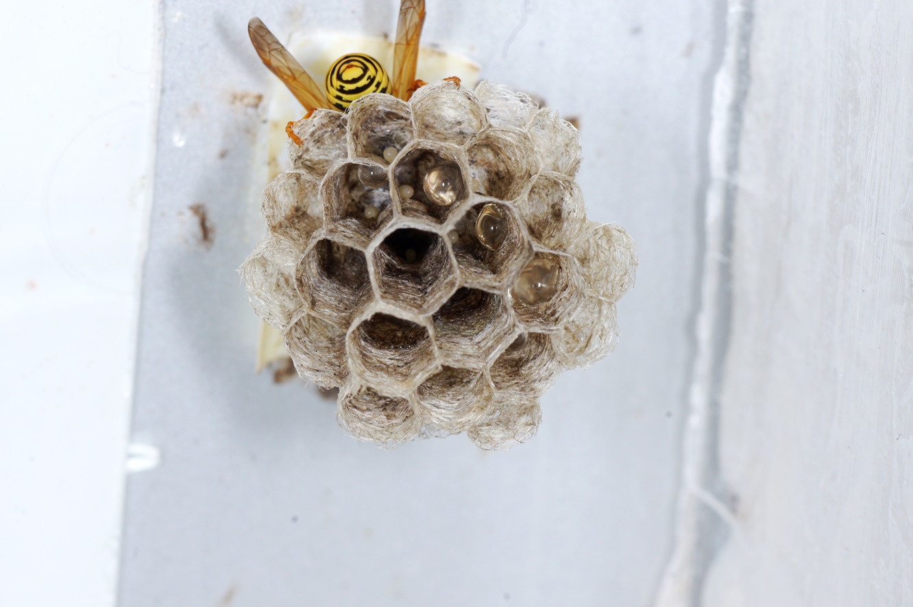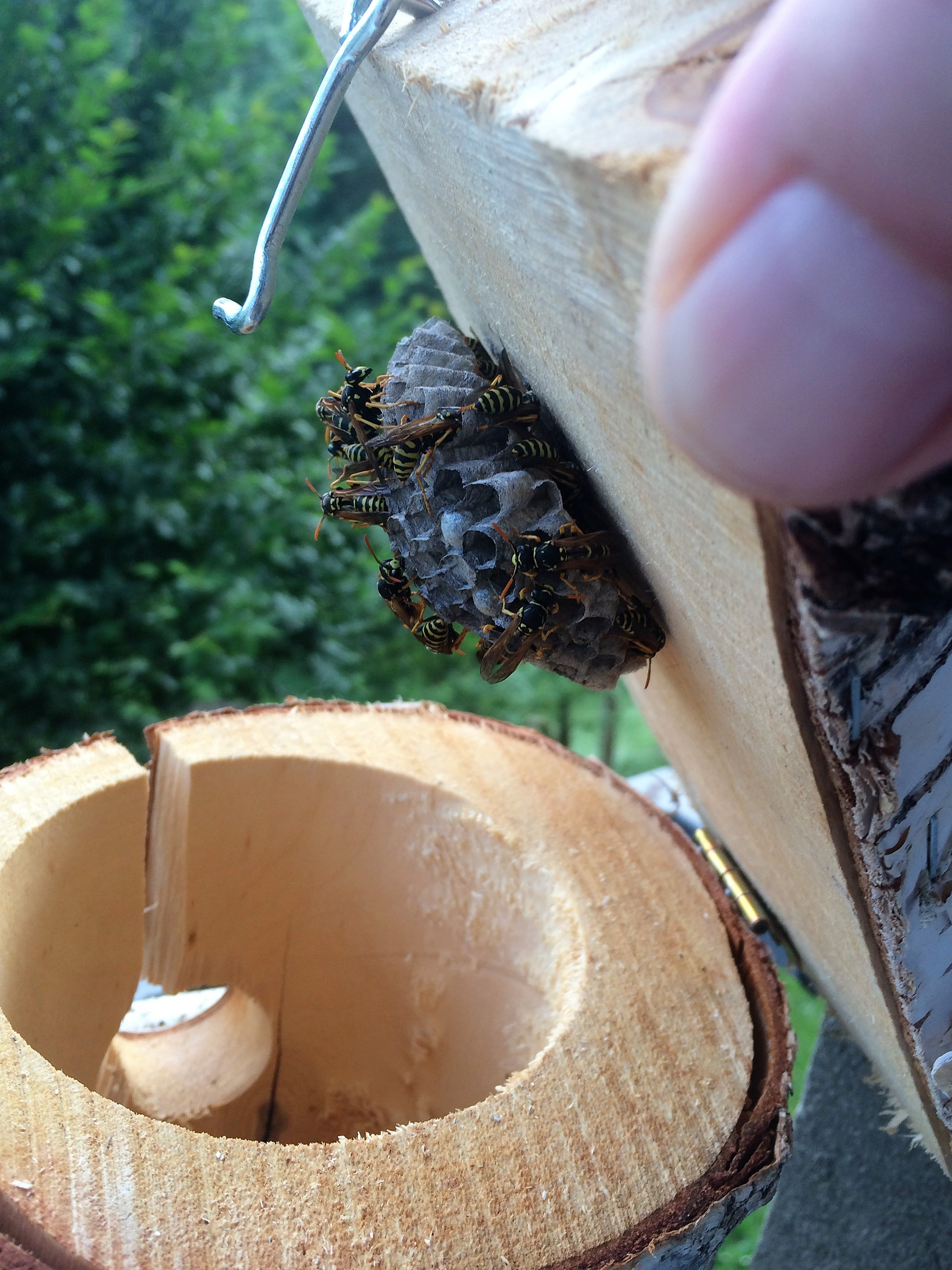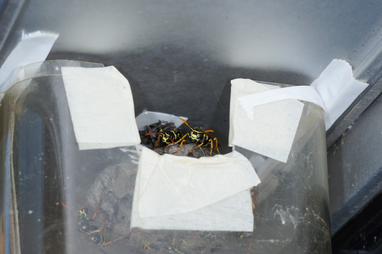 Polistes-Königin gebaut! Ich habe das Brettchen öfter etwas herausgezogen, mich den bösen Blicken der Königin und ihrer bald erschienenen Arbeiterinen ausgesetzt, und es