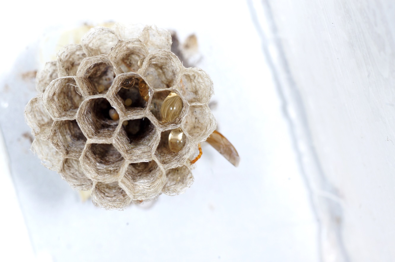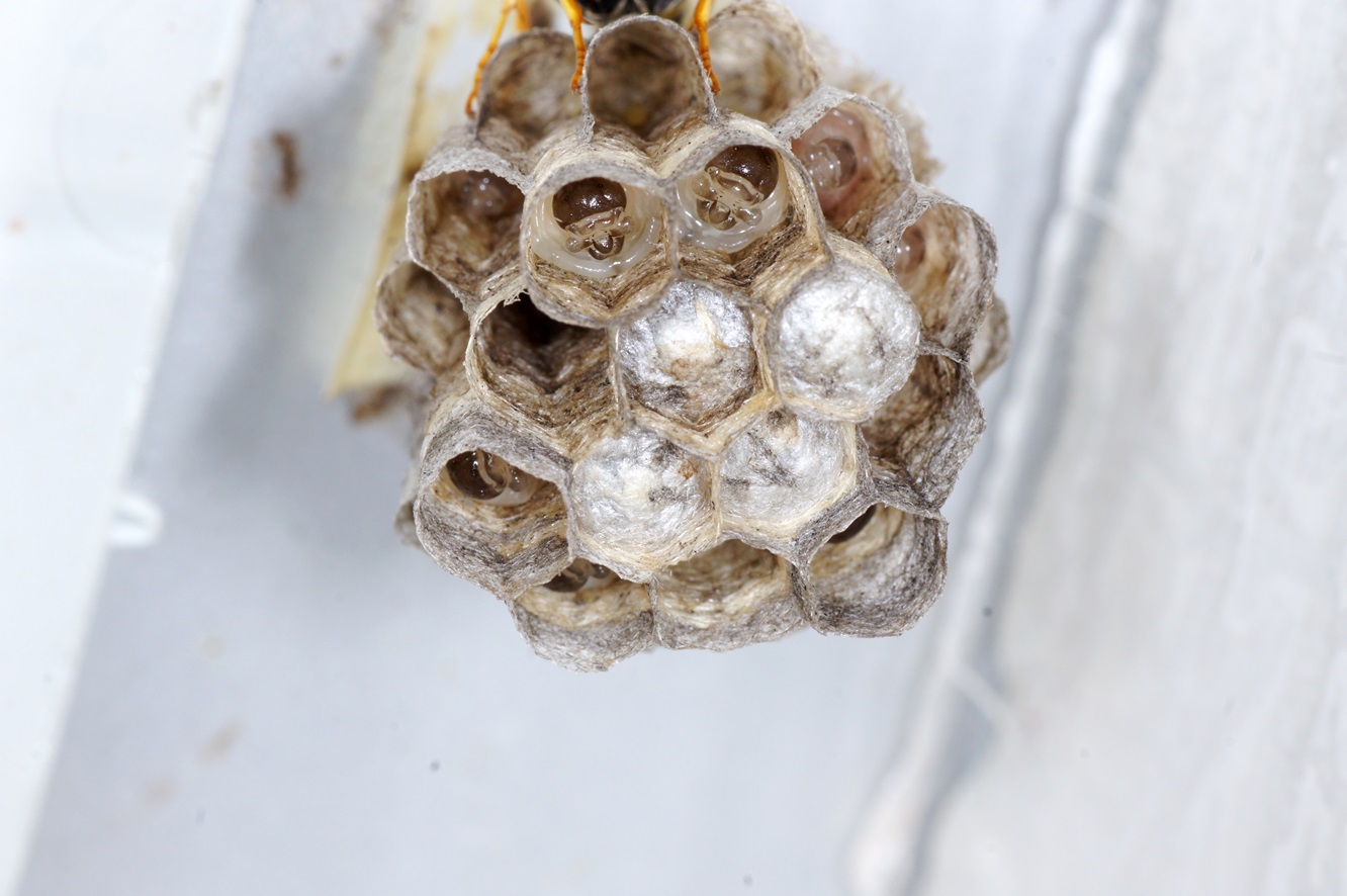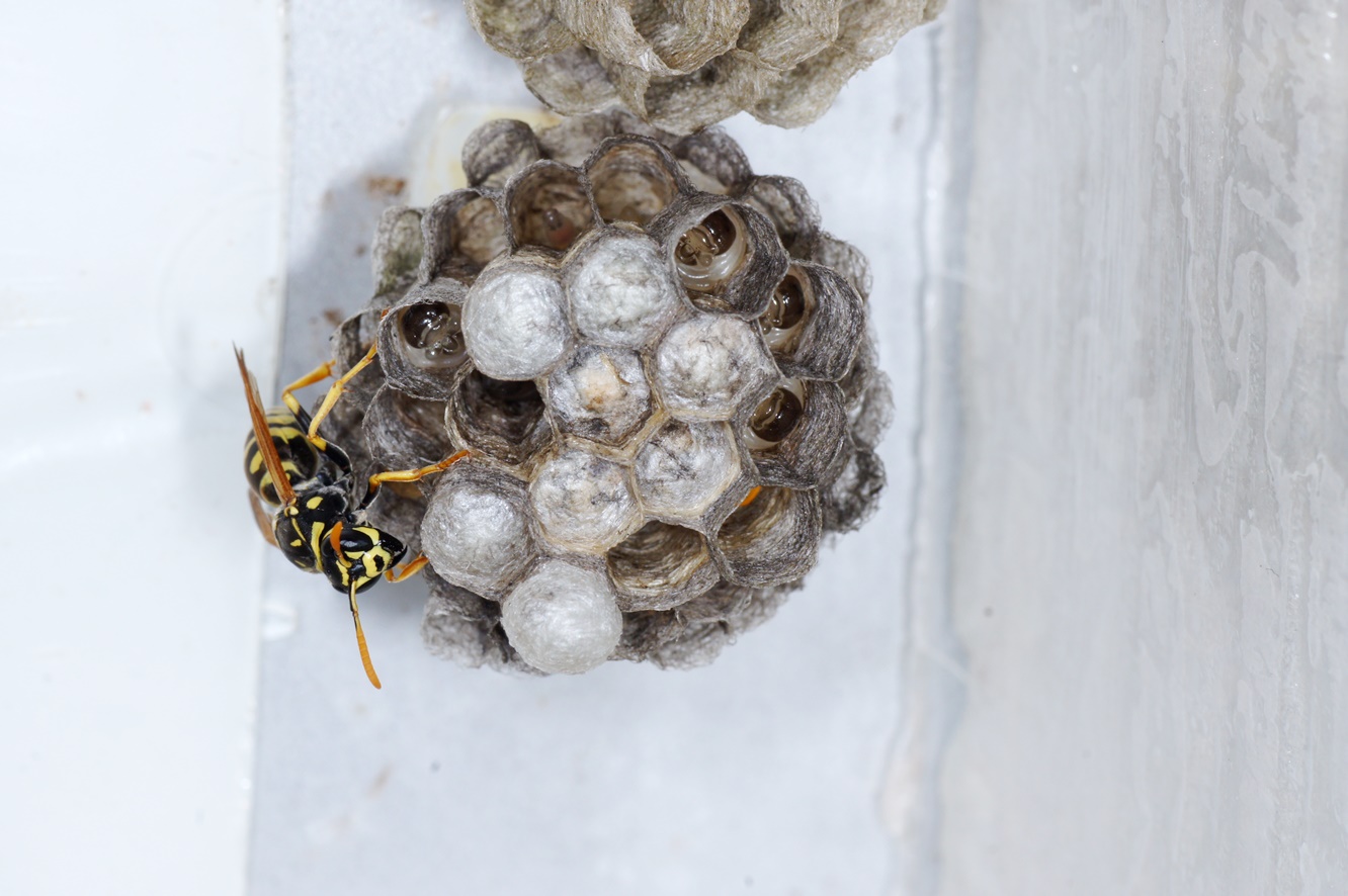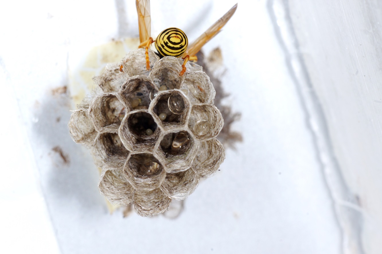 Polistes-Königin gebaut! Ich habe das Brettchen öfter etwas herausgezogen, mich den bösen Blicken der Königin und ihrer bald erschienenen Arbeiterinen ausgesetzt, und es