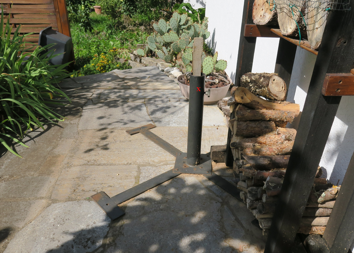 Da steht ein eiserner Ständer für einen „Marktschirm“, vor dem Bienenhotel, auf der Südseite des Hauses. Der Ständer wird seit Jahren kaum noch benutzt (aber wohin mit