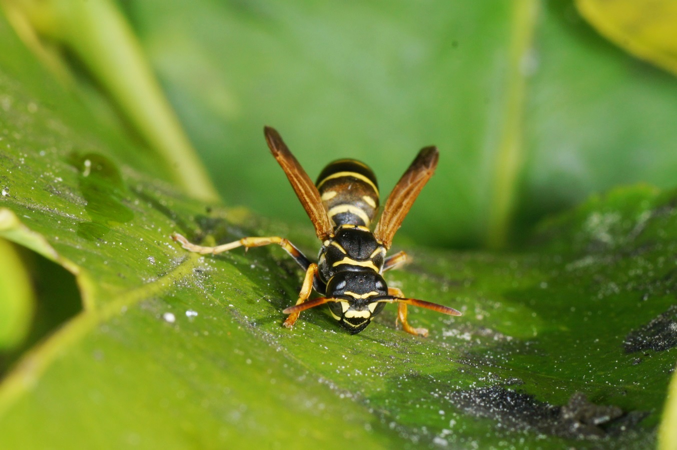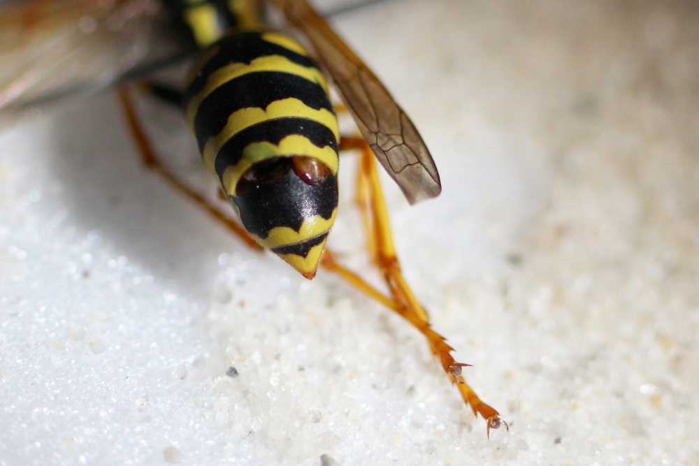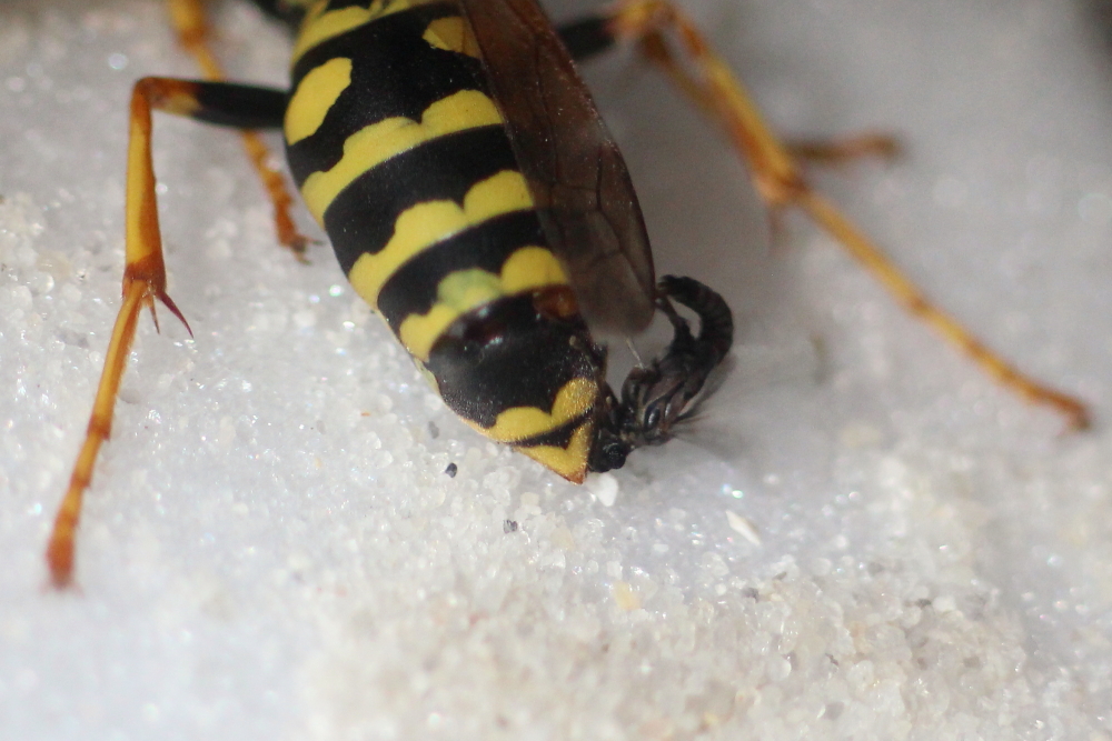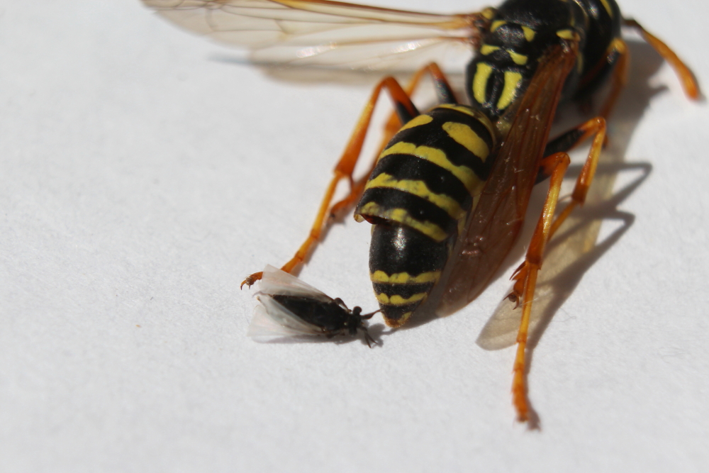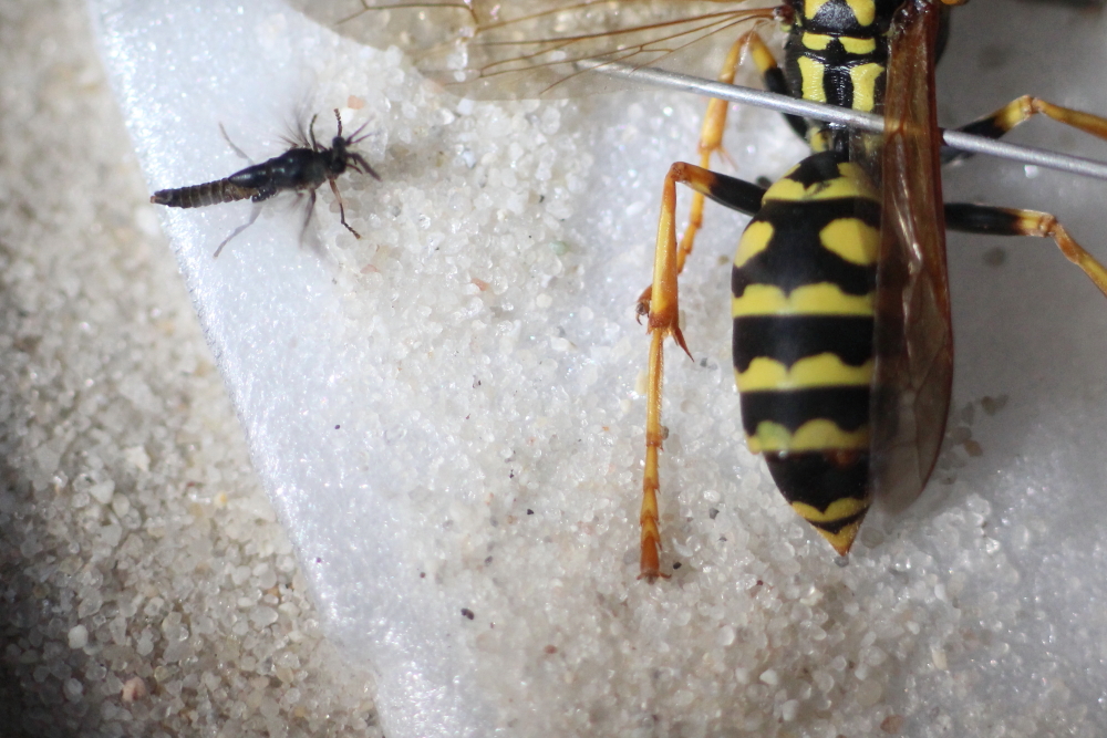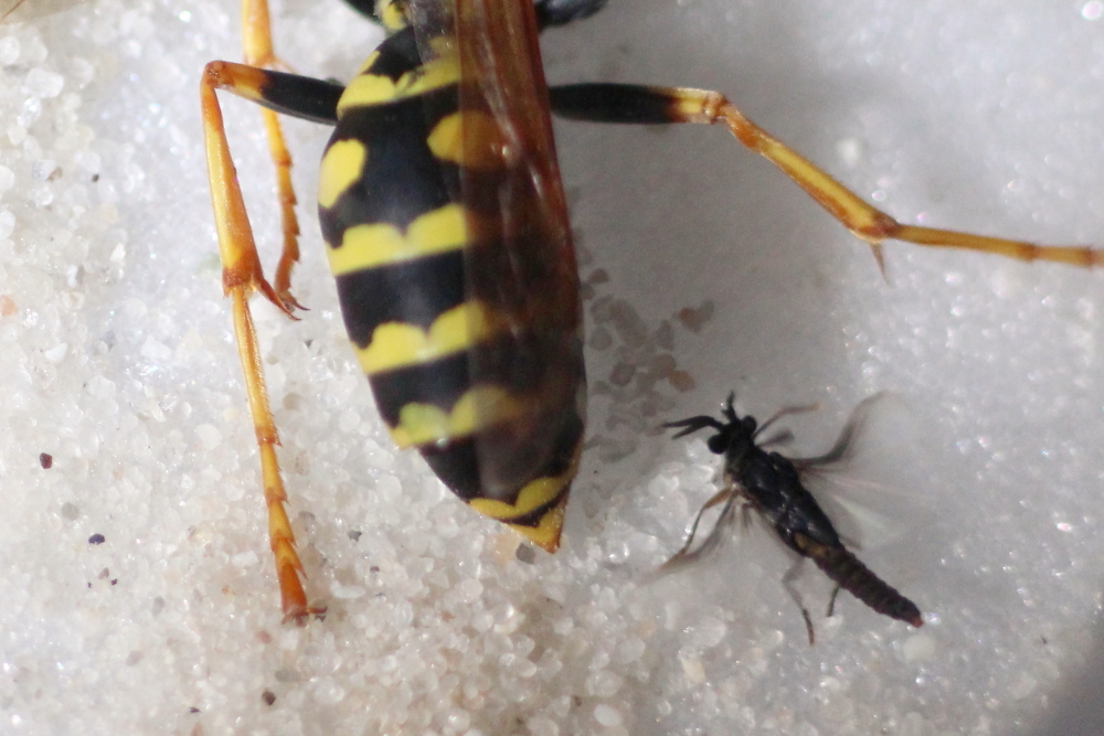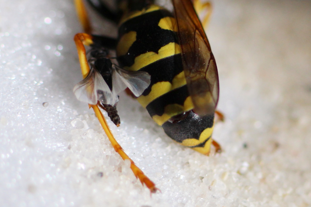 Das Völkchen ist allerdings klein geblieben. Manchmal sah ich fünf oder sechs Wespen darauf. Vermutlich haben die sehr hohen Temperaturen doch die Eier und/oder