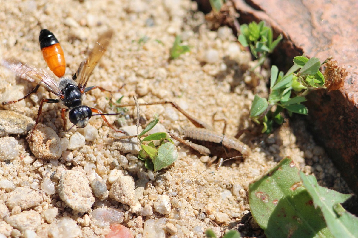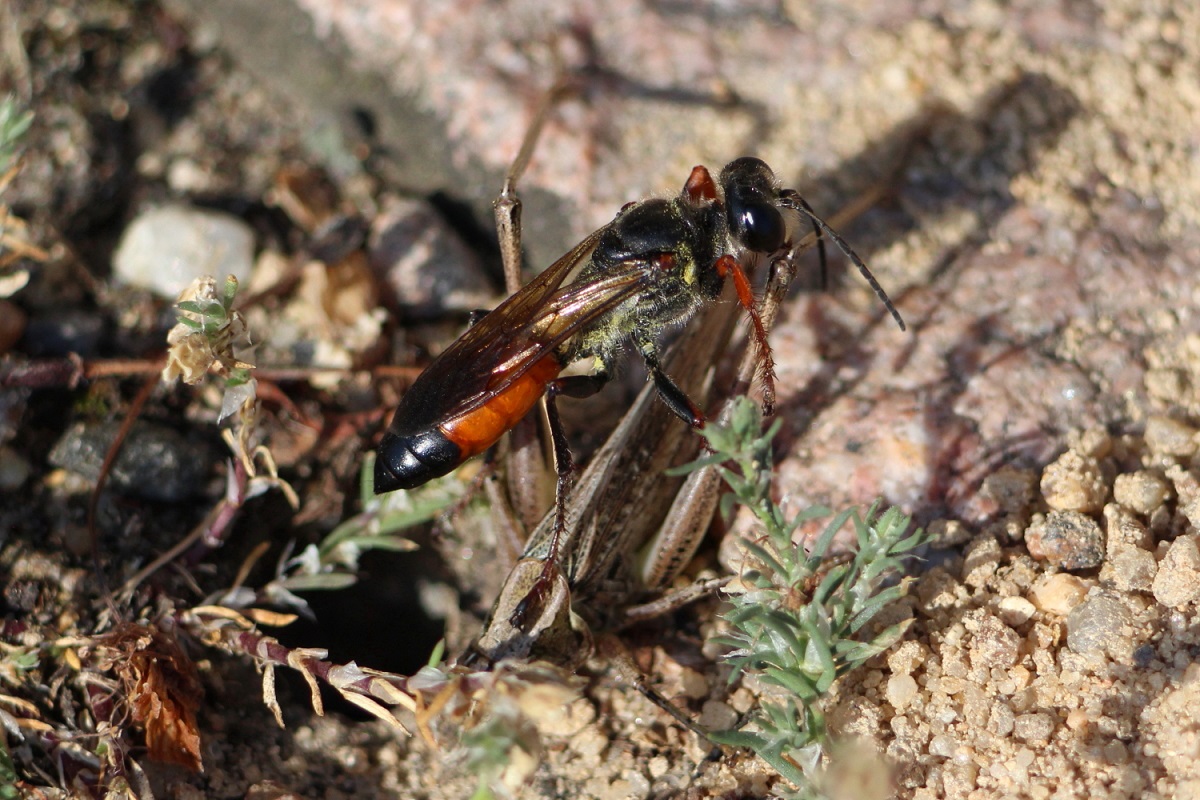Seit wenigen Tagen sind die im Juli 2018 erstmals hier aktiven Heuschreckensandwespen (Sphex funerarius) an gleicher Stelle bei der Brutfürsorge zu beobachten. Zum Glück gab es zwischenzeitlich kein Elb-Hochwasser, so überlebte die Vorjahresbrut optimal.