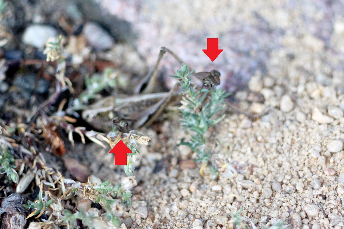 In der Nähe eines Nesteinganges finde ich in unmittelbarer Nähe der gelähmten Heuschrecken 2 Trabantenfliegen (Senotaine spec.). Sie werden aktiver, sobald die Wespe die Heuschrecke in die Röhre zieht: