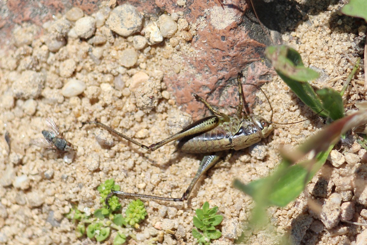 Diese kleinen Fleischfliegen haben sich darauf spezialisiert, ihre Eier an die reglosen Heuschrecken abzulegen, die unter der Erde eigentlich Nahrung für die Wespenlarve sein sollten.