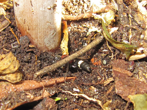 Nachdem dem es den Eingang zugescharrt hatte, flog das Tierchen auf ein Stütz-Gestänge für Kletterpflanzen, welches im selben Topf verankert ist, ptuzte sich kurz und flog dann für mindestens 30 Minuten weg.