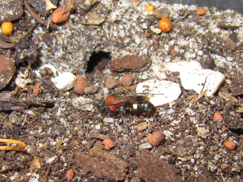 Eine erfreuliche und nicht gerade alltägliche Beobachtung durfte ich heute auf meinem Balkon machen. Eine kleine, ca. 10 mm lange, bunt gefärbte Grabwespe, mit rotem Thorax und schwarzer Gaster, die mit einer weissen Binde versehen ist, hat sich ausgerechnet eine grosse Blumenkiste auf meinem Balkon als Nistplatz ausgesucht. Sie scheint ihren Stollen leicht schräg (zumindest beim Eingang nicht senkrecht) in das sandiges Blumenerdegemisch zu graben. Angangs war sie noch oft bei "Umgebungsarbeiten" an der Oberfläche zu beobachten, mittlerweile sehe ich sie nur noch ganz kurz, rückwärtskommend Erde aus dem Bau schaufeln.