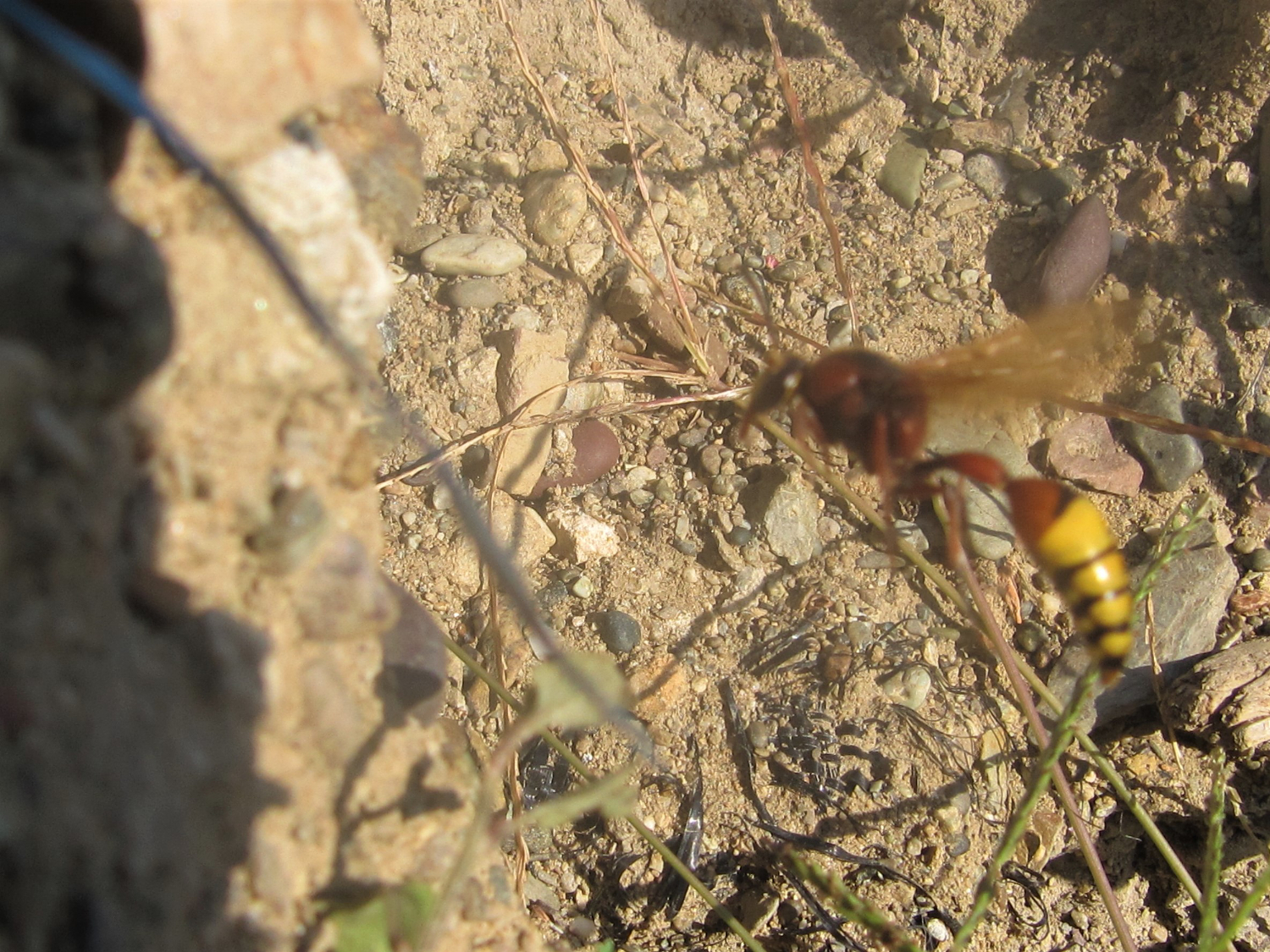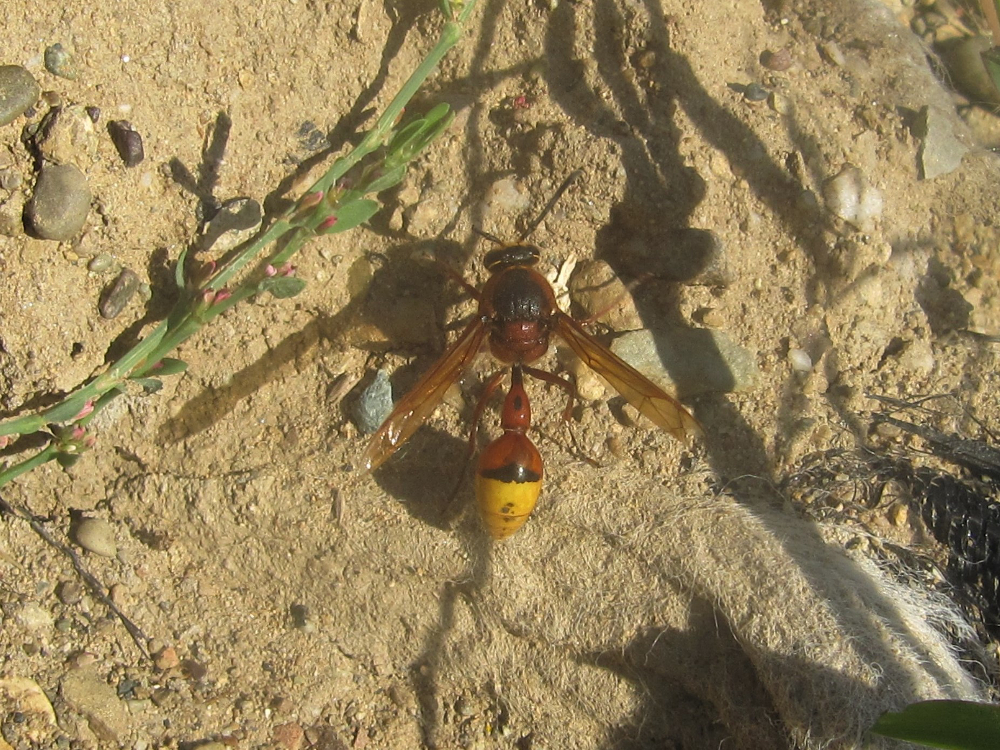 Die Grosse Lehmwespe Delta unguiculatum (Delta unguiculata?) ist für mich die eindrücklichste unserer einheimischen Solitärwespen. Die Weibchen werden bis 26mm lang, aber glaubt mir, wenn ihr eine seht, schätzt ihr sie bestimmt grösser. Das liegt bestimmt nicht nur an der 5,5cm Flügelspannweite, sondern auch am mächtigen Thorax und der schönen, wie auffälligen Färbung, die wegen dem Rotanteil an unsere Hornissen erinnert.