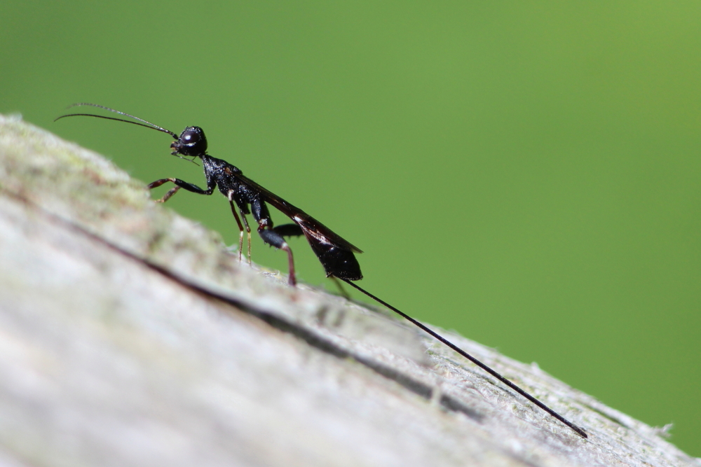 Vor wenigen Tagen gelang das Foto einer interessanten Kronenwespe (Stephanus serrator). Das Weibchen suchte hier nach Käferlarven im Totholz.