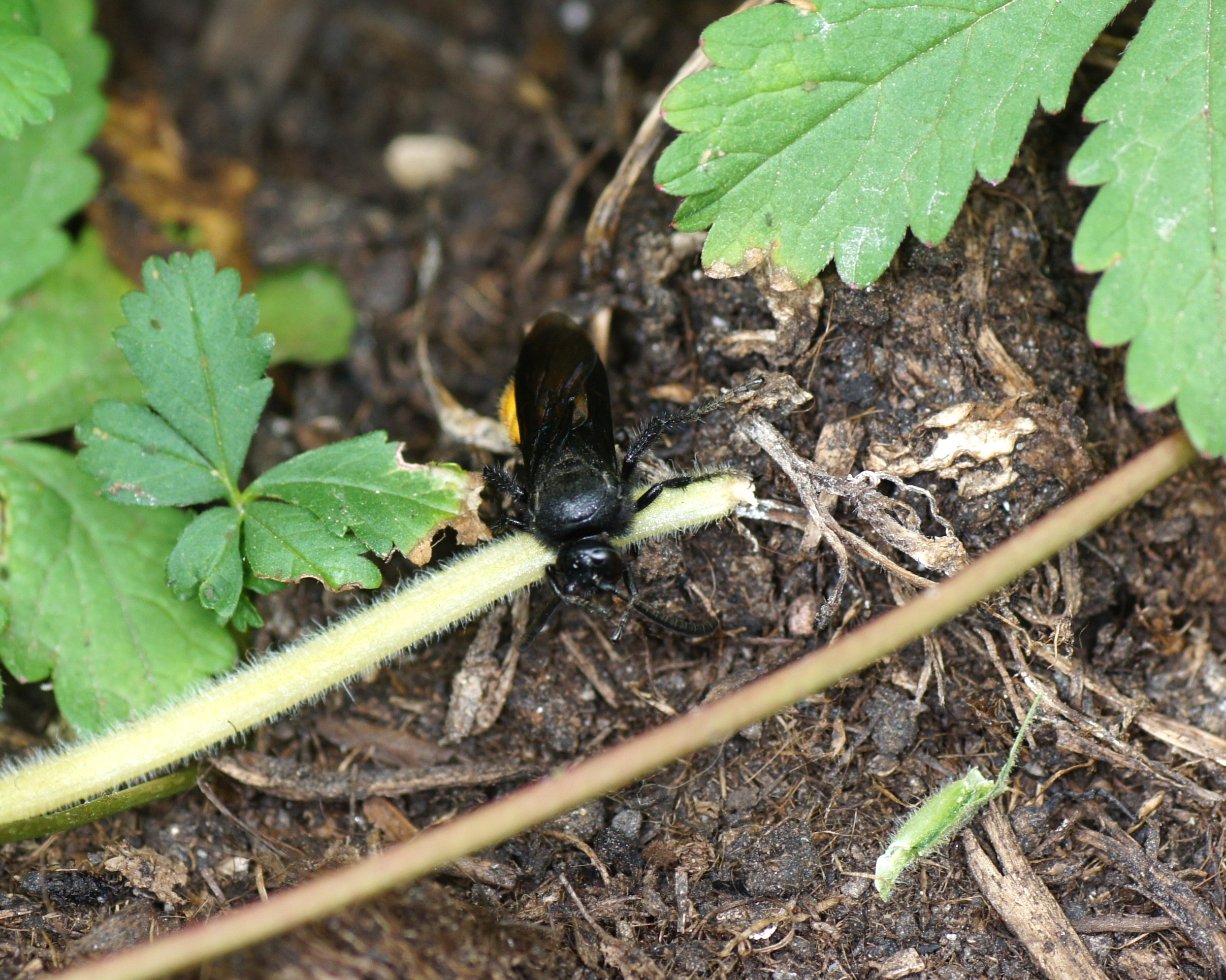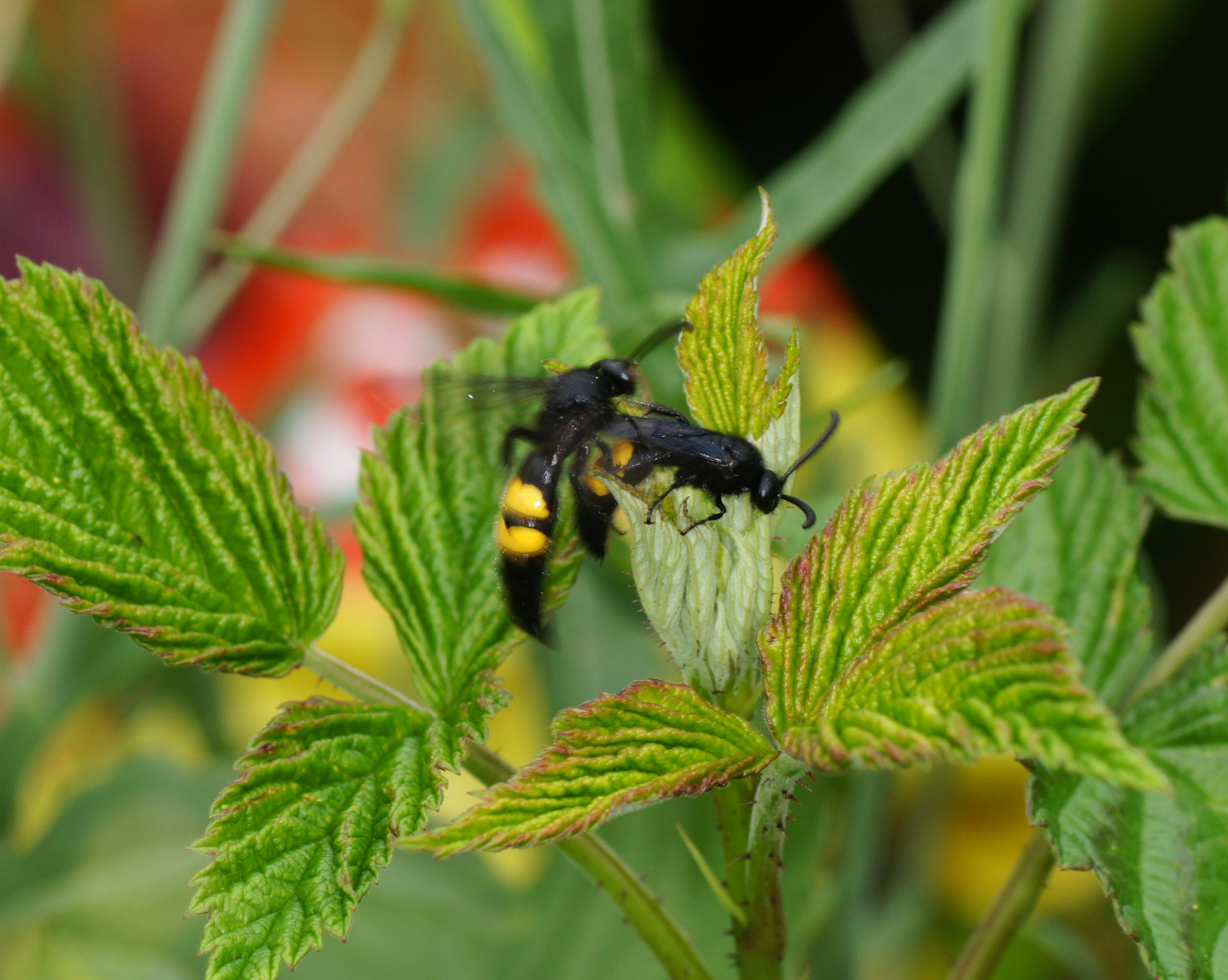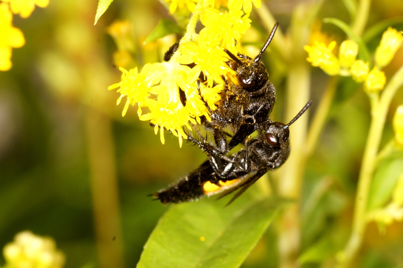 Reber hat hier schon vor 4 Jahren (05.08.2016) über Dolchwespen berichtet. Meine Fotos sind zwar nicht so gut, ich möchte aber meine Erstsichtung von Scolia cf. hirta, der borstigen Dolchwespe melden. Erstmals seit ich mich erinnern kann, habe ich eine Dolchwespe im Garten entdeckt. Und nicht nur das, 2 Weibchen gleichzeitig (fast 2 cm lang) und zwei Männchen (geschätzte 15-16 mm lang) und kurzfristig haben diese Männchen gleichzeitig die Begattung eines Weibchens versucht. Fotos sind mir dazu nicht gelungen, aber einen "normalen" Begattungsvorgang mit einem Männchen habe ich einigermaßen hinbekommen. Alles spielt sich in meinem Beet mit inländischen und kanadischen Goldruten ab, ausschließlich diese gelb blühenden Pflanzen werden besucht. Das Beet mit Solidago spp. ist etwa 3 m lang und ca. 80 cm breit.