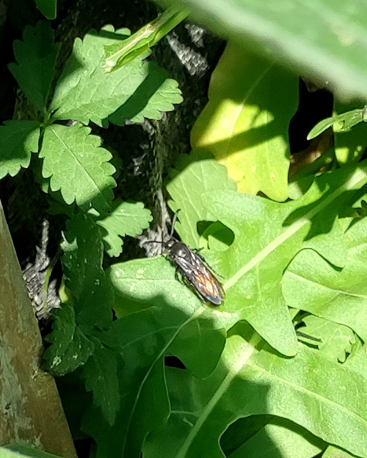 Die Flügel der Insekten sind zwar bräunlich gefärbt, bei entsprechendem Lichteinfall schillern sie aber stahlblau - ähnlich wie bei Isodontia mexicana!