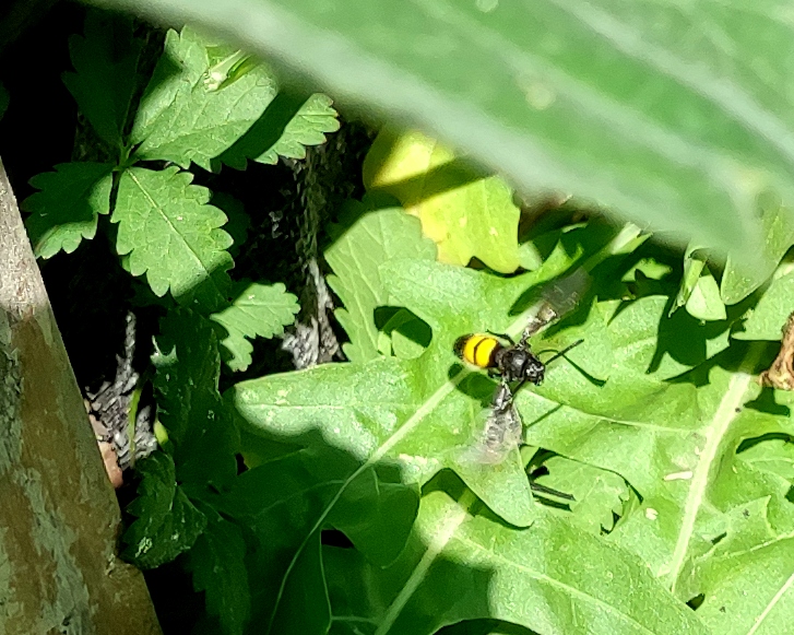 Zuletzt heute nach 11:30. Die Wespen fliegen wie am ersten Beobachtungstag um das Hochbeet, zuletzt konnte ich zeitweise bis zu 7 Individuen unterscheiden. Die weiter oben genannte kleine Bodenareal wird nach wie vor häufig angeflogen und einzelne Exemplare lassen sich dort immer wieder nieder.
