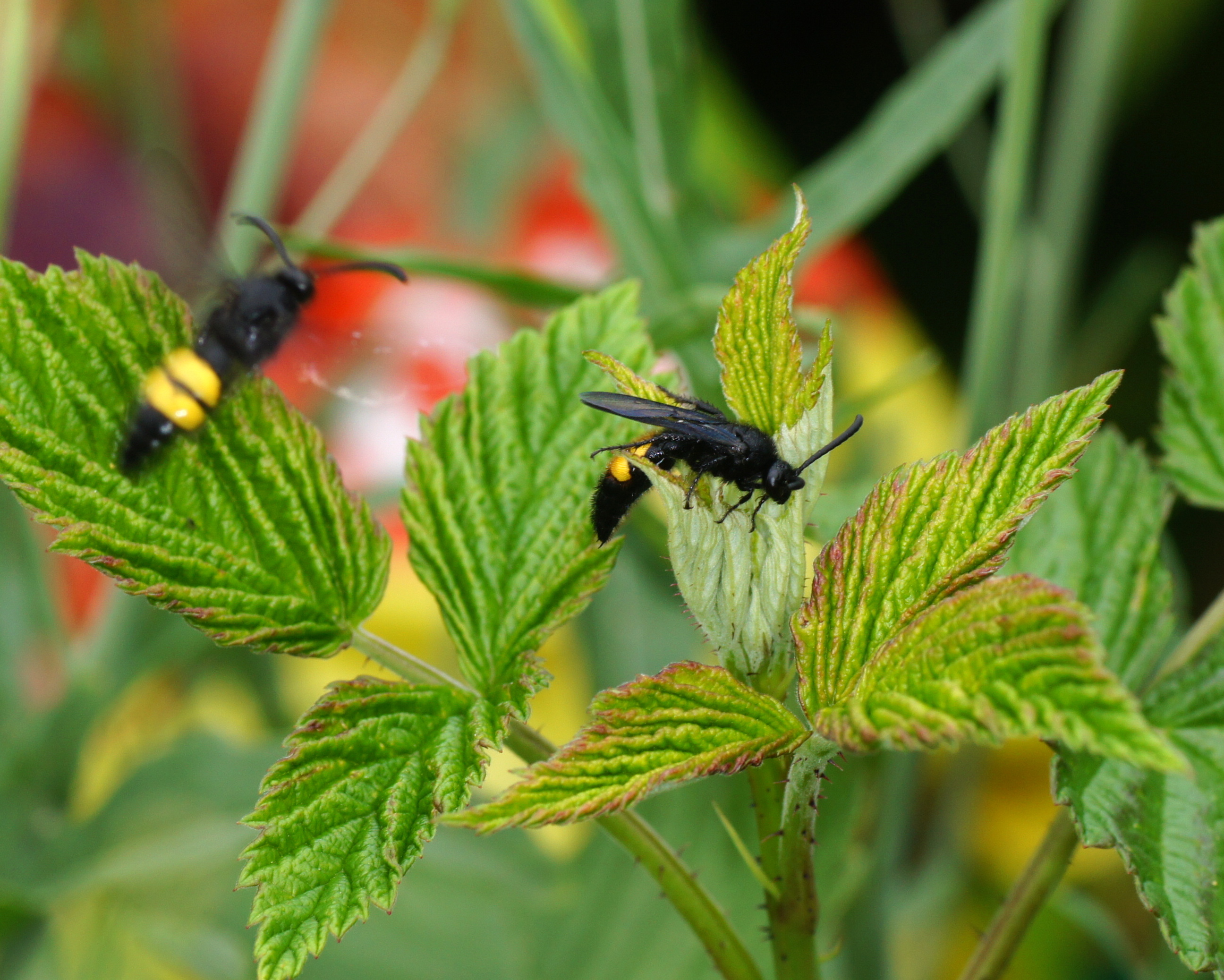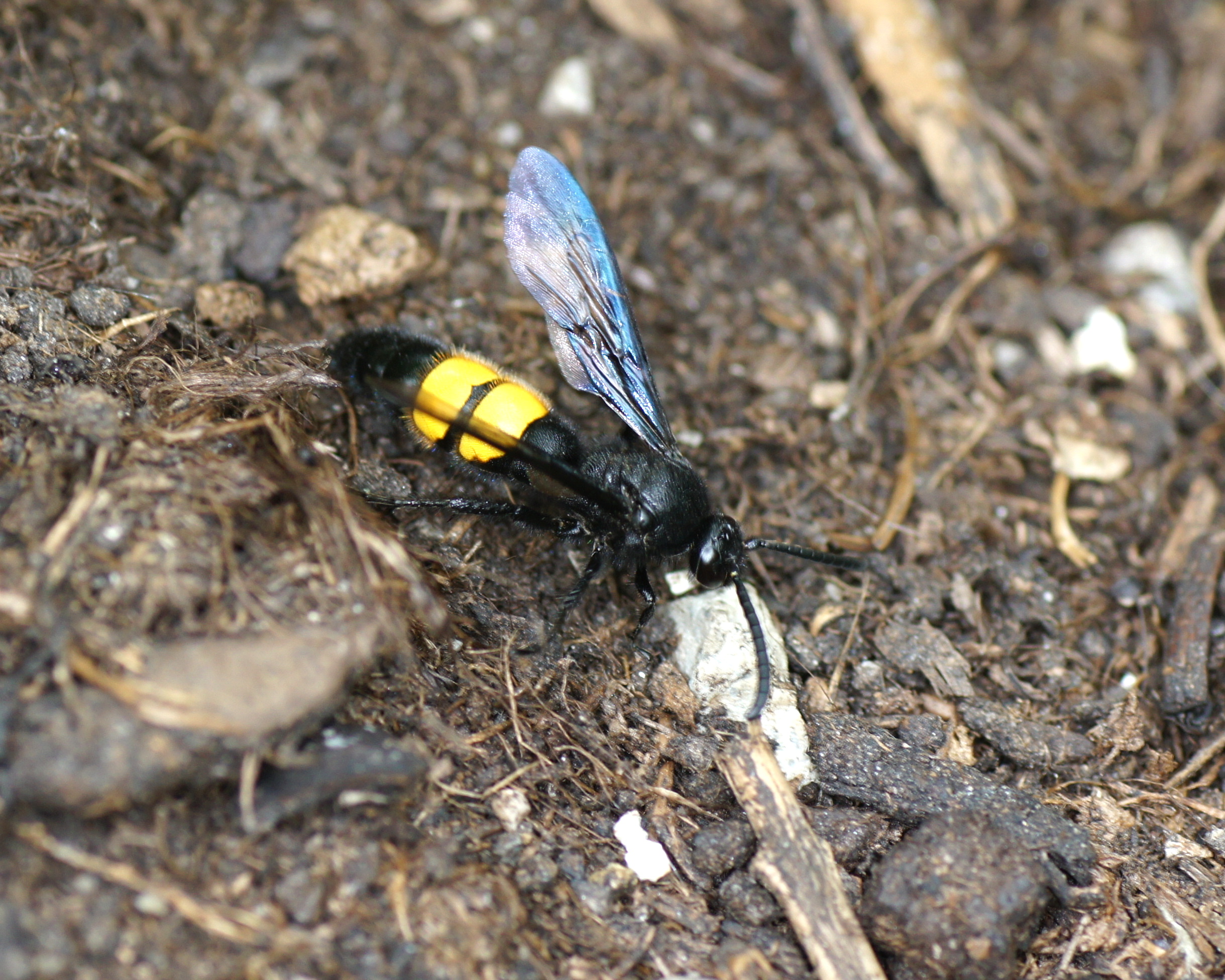 Es wäre möglich, dass sich die Tiere wegen der Klimaerwärmung auf dem Vormarsch befinden? Und auch dass deine Tiere an gelbe Blüten gehen, ist vielleicht eine Anpassung? Ich habe immer gelernt, sie bevorzugen blaue/violette Blüten. Dein Naturgarten ist aber bestimmt ein geeignetes Habitat für die Tiere: Die vielen Blüten sollten nicht nur den adulten Exemplaren als Nahrung dienen, sondern auch den Blatthornkäfern (Junikäfer und Rosenkäfer!) deren Larven die Wespe parasitiert.