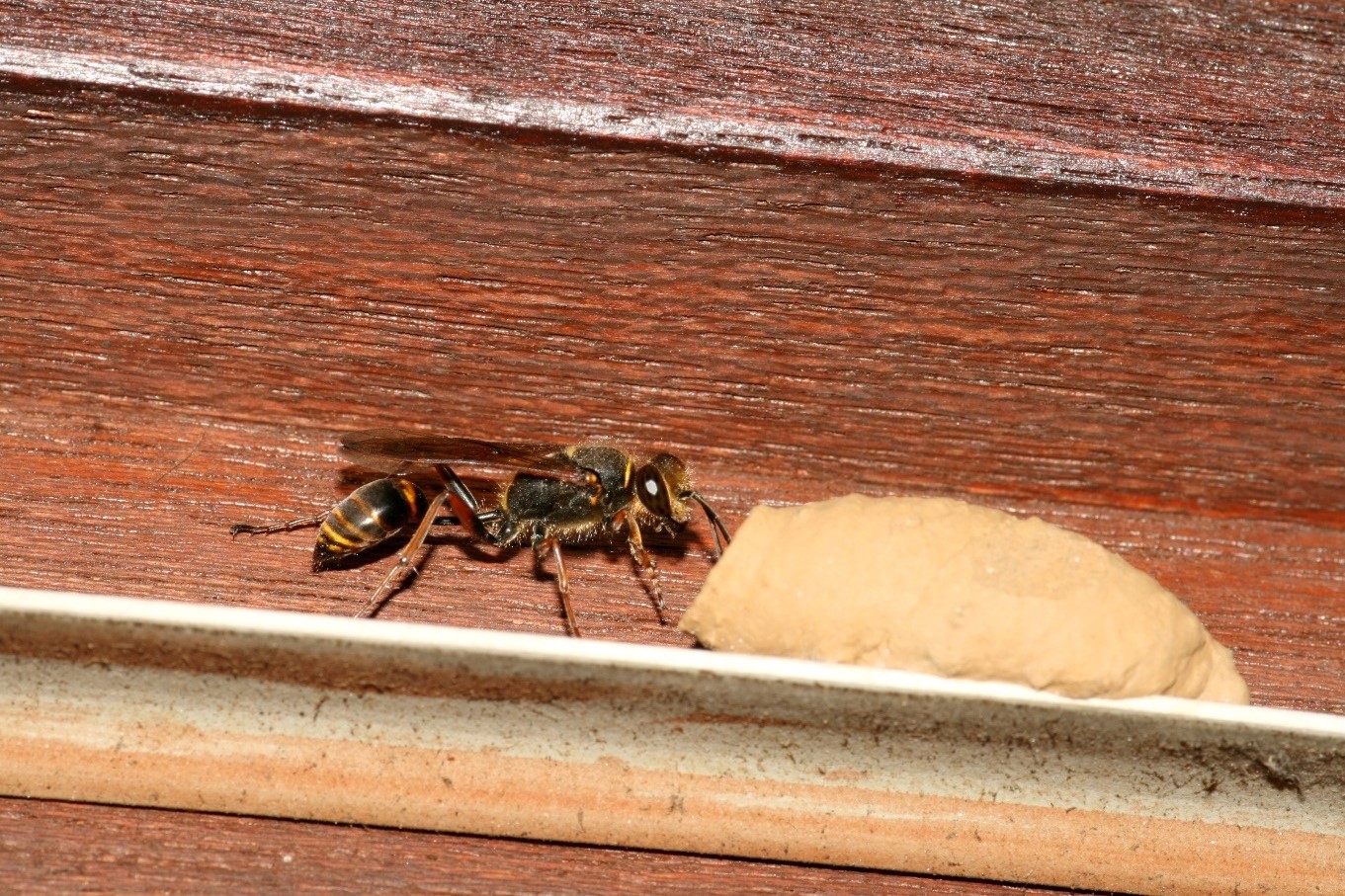 Sceliphron sp., vermutlich Sceliphron curvatum. Eine Mauerwespe, könnte die Orientalische Mauerwespe sein. Das Foto aus dem Jahre 2009 (mit einer Bridge-Kamera aufgenommen) zeigt das Individuum bei seinem Tönnchen-Nest. Das Nest befand sich im Rahmen eines gekippten Dachfensters.