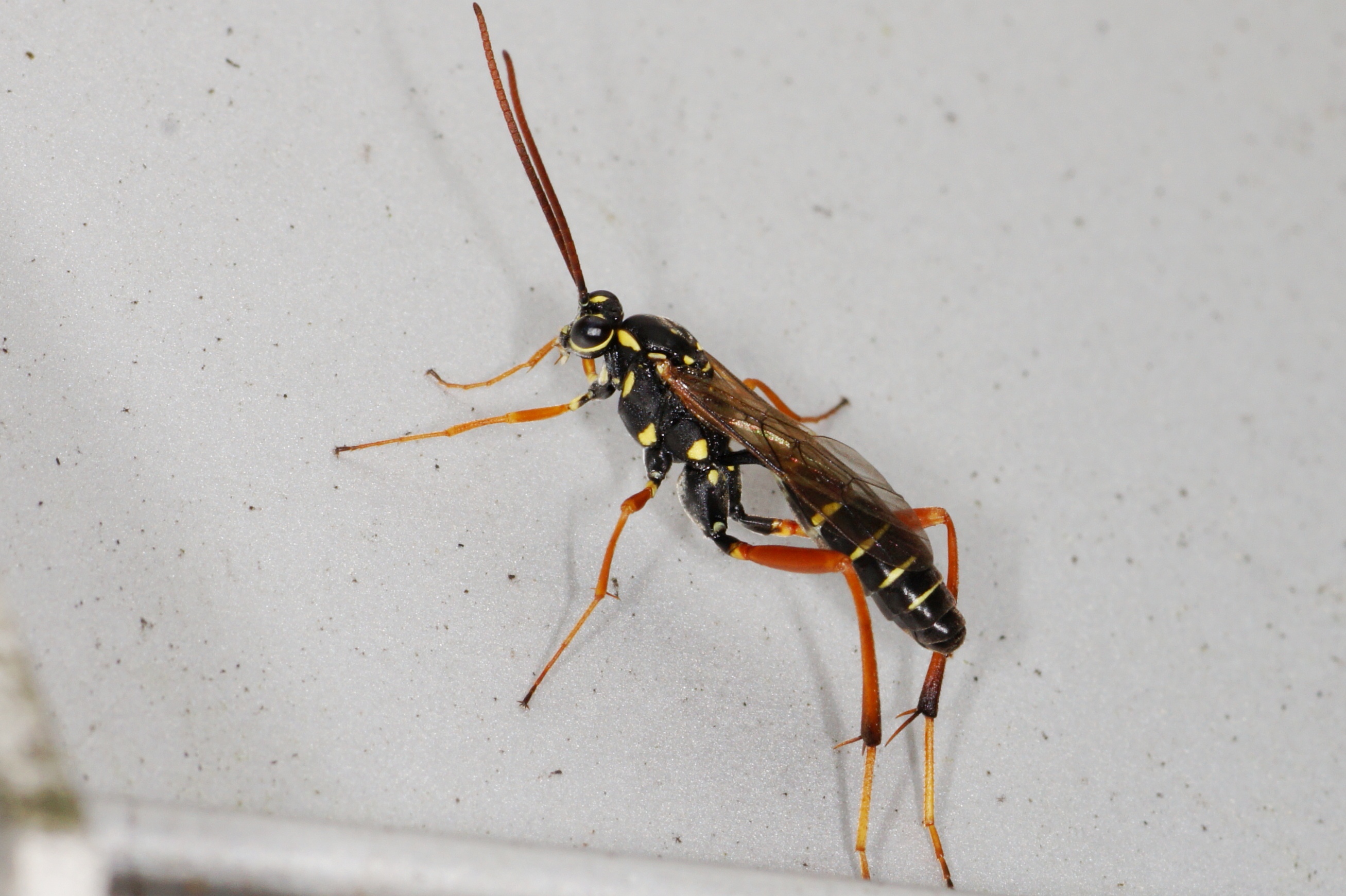 Schon vor ein paar Jahren hat sich diese schöne Schlupfwespe in mein Glashaus verirrt. Ich habe sie damals eingefangen und frei gelassen. Die Art kann ich nicht bestimmen.