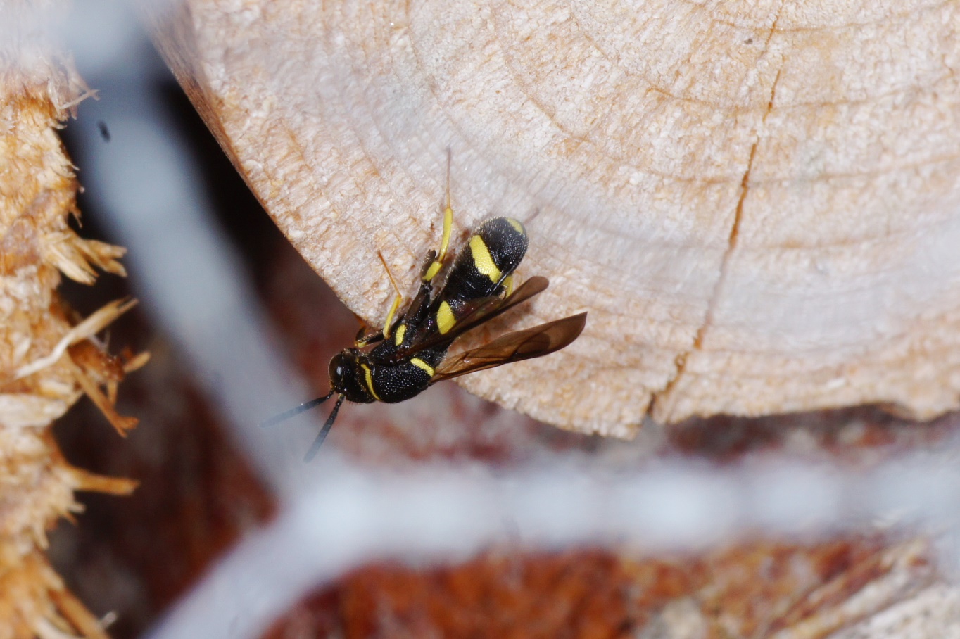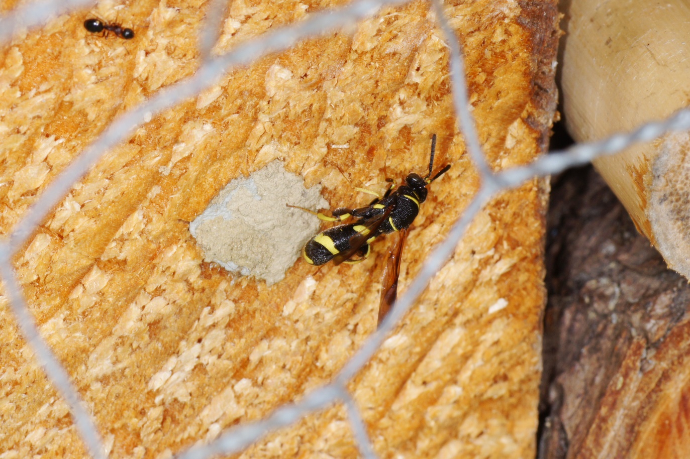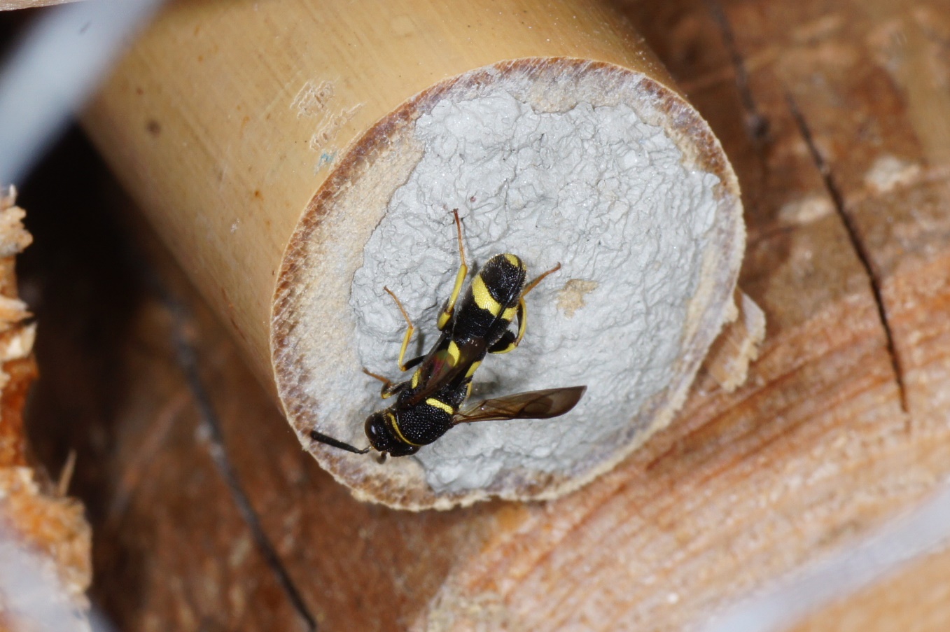 Danke für die Antwort! Mit freiem Auge konnte man nicht erkennen, was das Insekt da treibt. Erst jetzt erkenne ich, dass der Legestachel tatsächlich auf dem Hinterleib dorsal aufliegt; Ist bekannt, ob er diesen durch den Nestverschluss bohren kann?