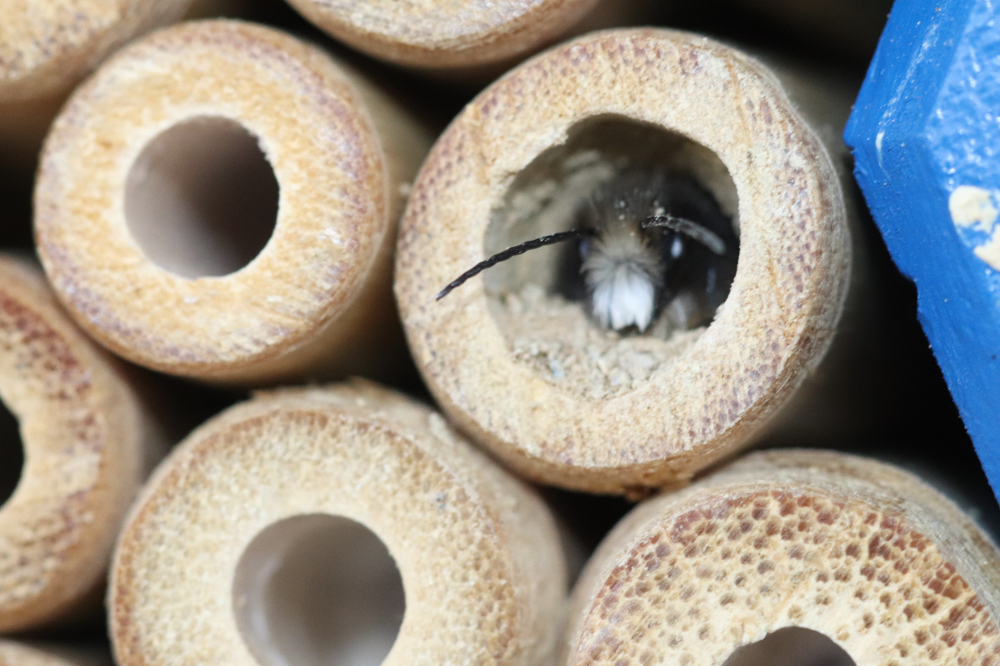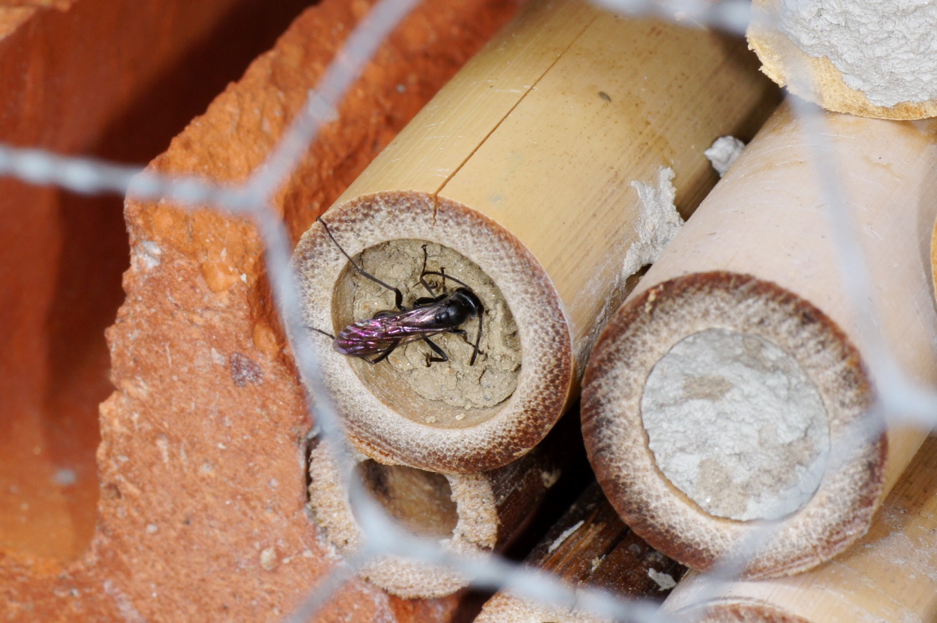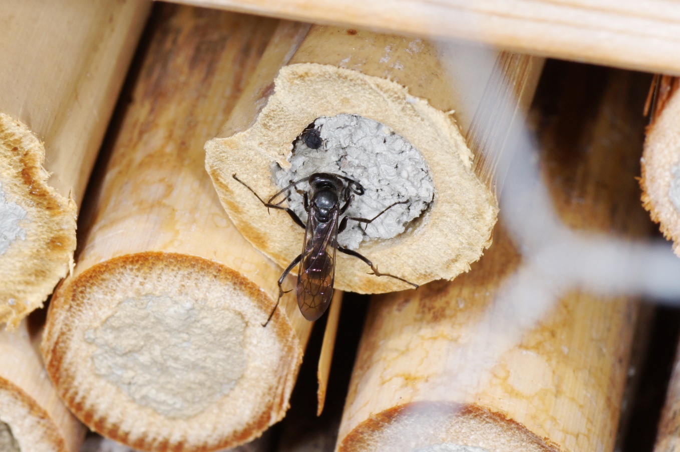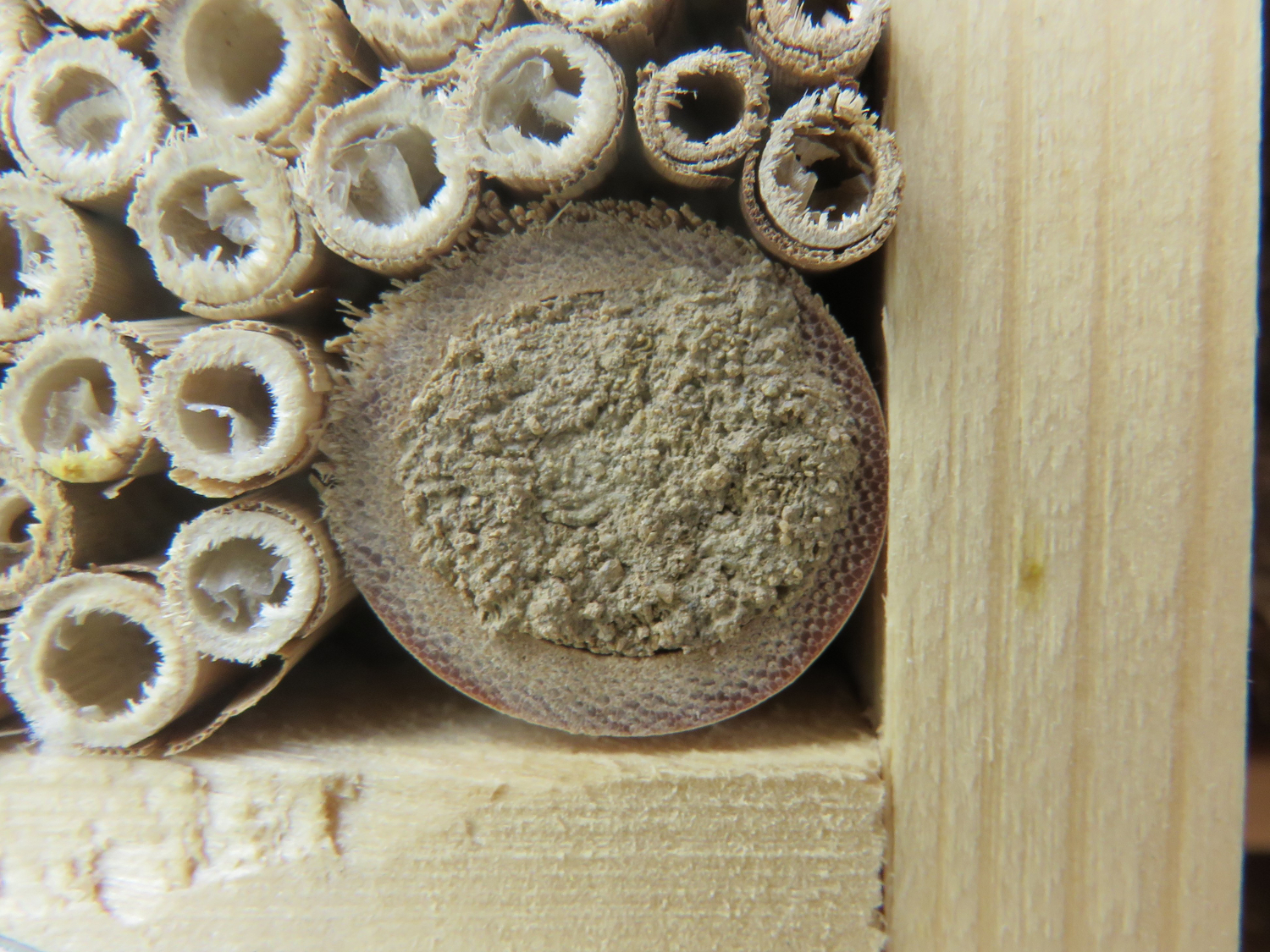 Doch dann erlebte ich eine Überraschung: Obwohl noch jede Menge, teilweise neue 8 mm Pappröhrchen und Holzbohrungen vorhanden waren, konnte ich ein Weibchen beim Reinigen der Seitenwände eines der, wie mir schien, viel zu grossen Halme beobachten. Zuerst dachte ich, dass es seinen Fehler schon noch bemerken und bald eine bessere Wahl treffen würde. Doch dann konnte ich an einem weiteren Halm mit 14 mm Innendurchmesser ein Weibchen beobachten, das gerade seinen eindrücklichen Verschlusspfropfen aus feuchtem Sand und Drüsensekret fertigstellte. Unglaublich, diese Flexibilität!