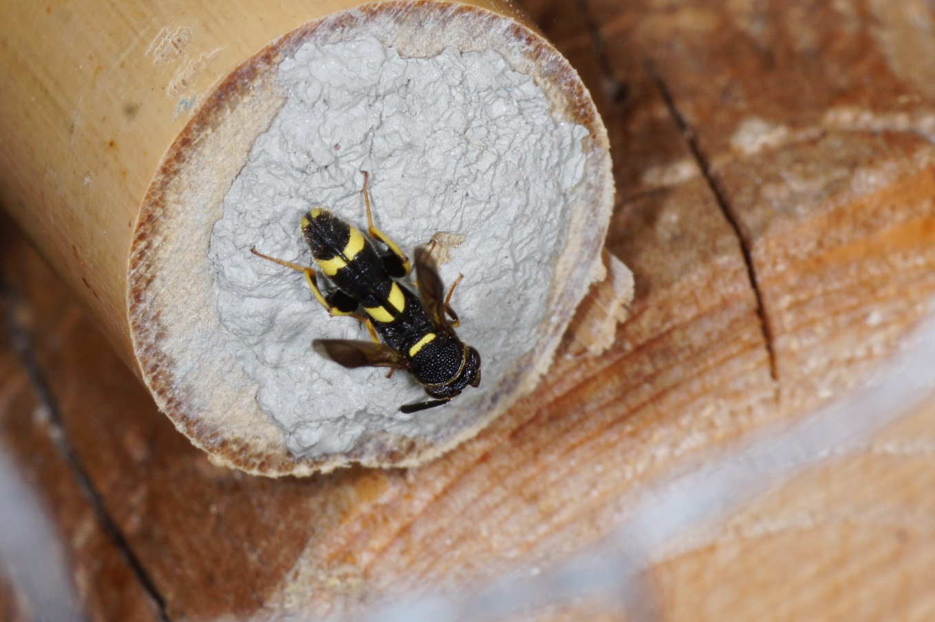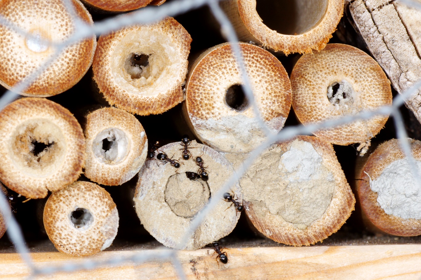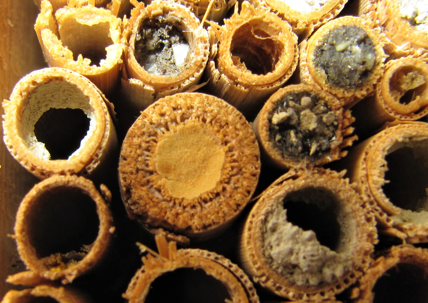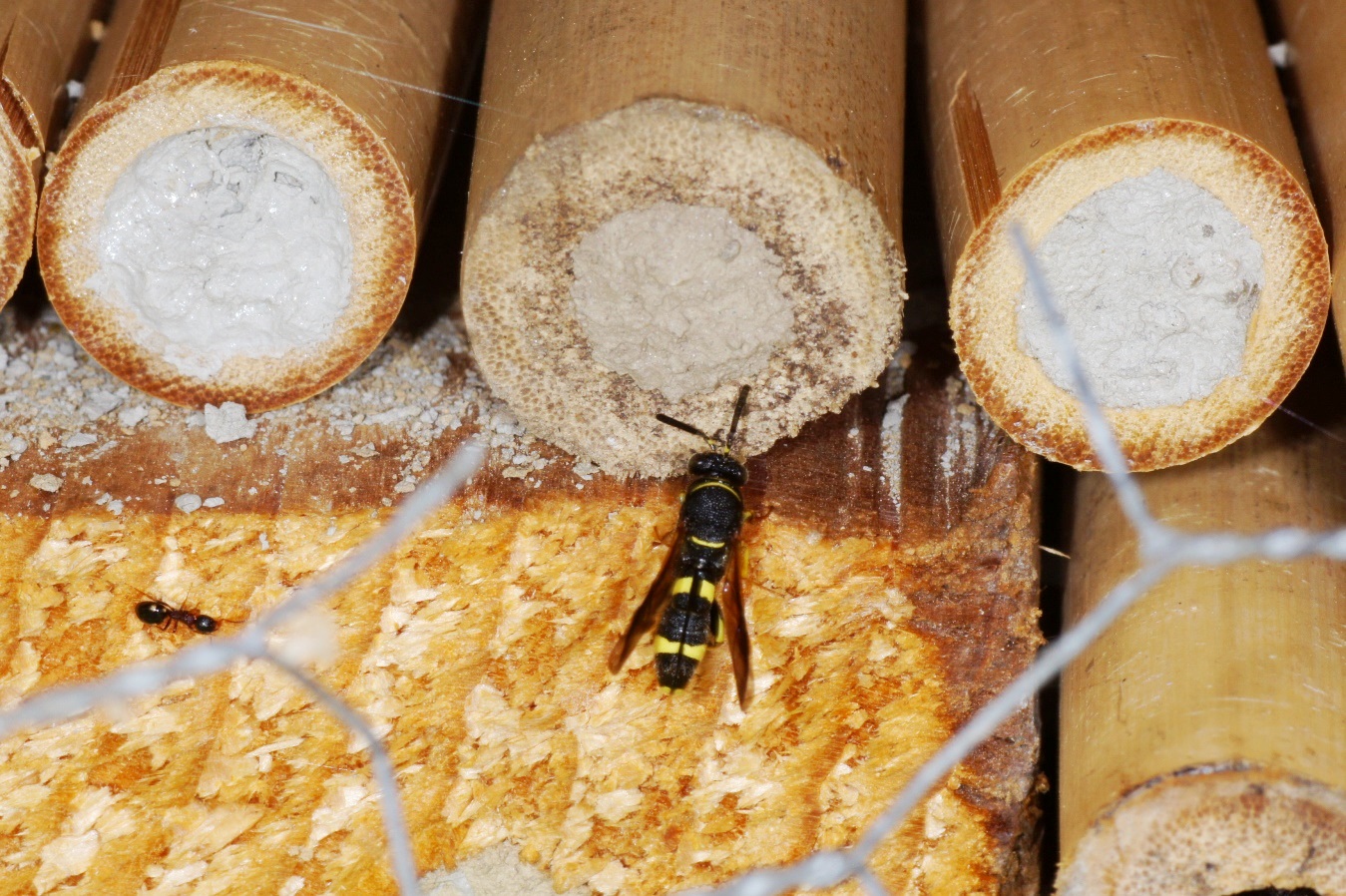 Doch dann erlebte ich eine Überraschung: Obwohl noch jede Menge, teilweise neue 8 mm Pappröhrchen und Holzbohrungen vorhanden waren, konnte ich ein Weibchen beim Reinigen der Seitenwände eines der, wie mir schien, viel zu grossen Halme beobachten. Zuerst dachte ich, dass es seinen Fehler schon noch bemerken und bald eine bessere Wahl treffen würde. Doch dann konnte ich an einem weiteren Halm mit 14 mm Innendurchmesser ein Weibchen beobachten, das gerade seinen eindrücklichen Verschlusspfropfen aus feuchtem Sand und Drüsensekret fertigstellte. Unglaublich, diese Flexibilität!