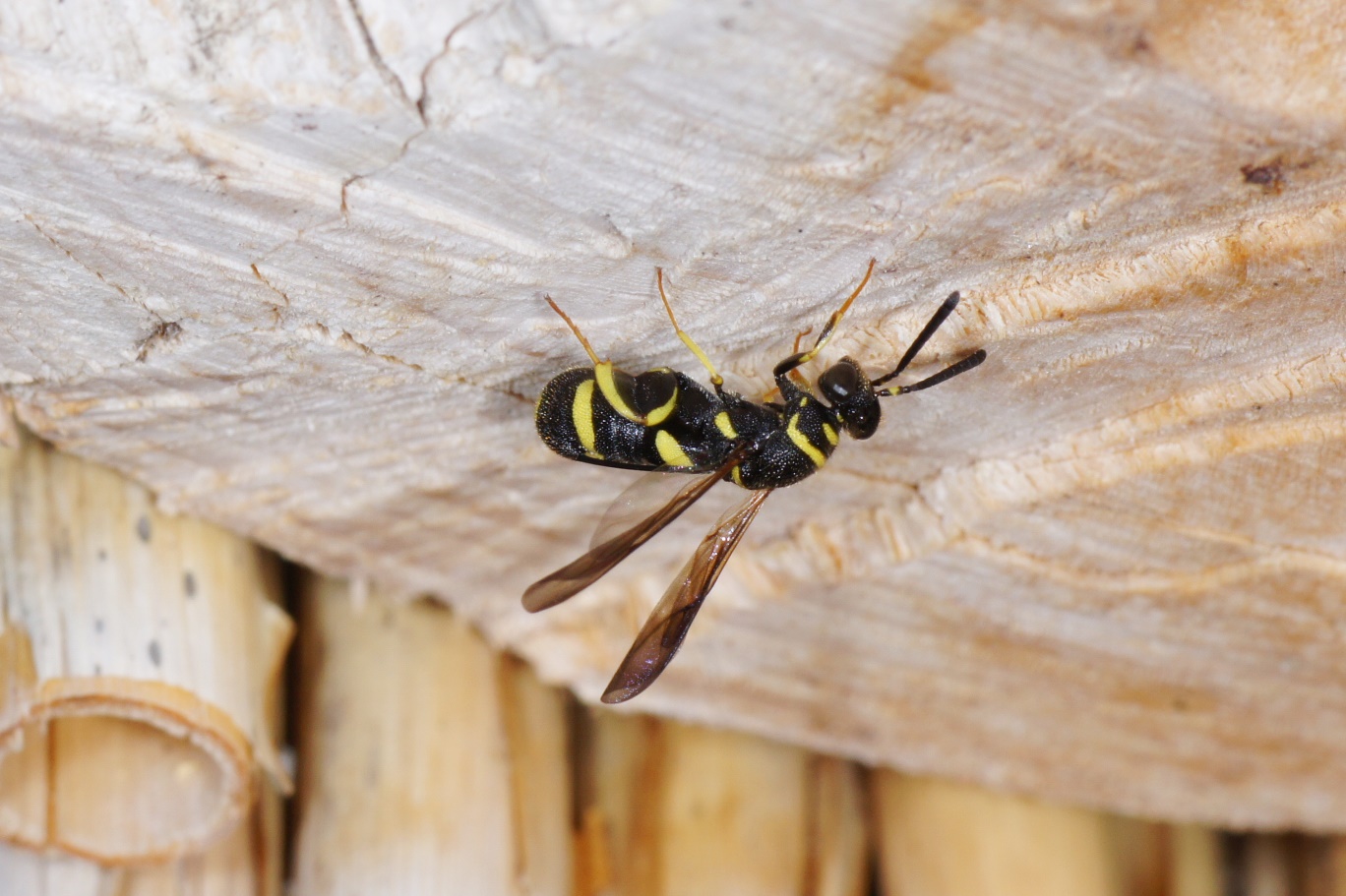 Auch eine solitäre Faltwespe konnte ich zum ersten Mal beobachten. Die Bestimmung ist für mich auch hier kaum möglich. Es könnte sich (wegen der Querkante mit mittlerer Längsfurche auf dem 1. Gastersegment, wegen der Grösse des Tieres von ca. 1 cm und des Durchmessers des Nistganges von ca. 5 mm, sowie der Tatsache, dass sie im Siedlungsbereich überhaupt auftritt und an Nisthilfen geht) um eine Symmorphus Art handeln.