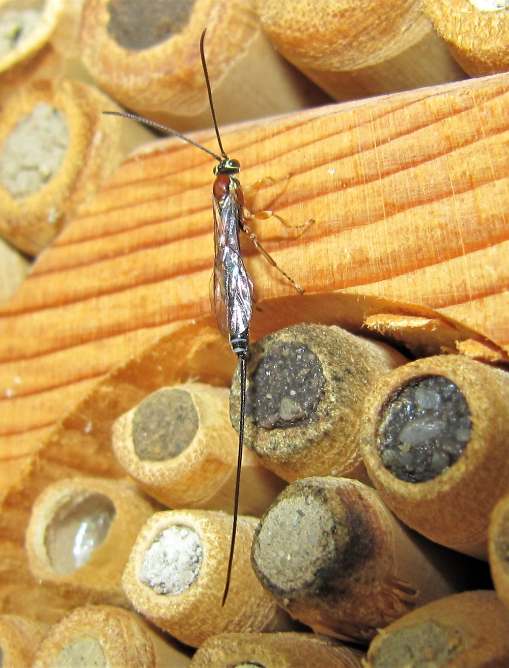 Auch bei mir tummeln sich nun vermehrt Parasiten rund um die Nisthilfen. Mich stört es nicht, weil immer etwas los ist und es darunter interessante Arten hat.Wie z.B. diese recht grosse, schön gefärbte Schlupfwespe, die ich aber nicht ansatzweise bestimmen kann.