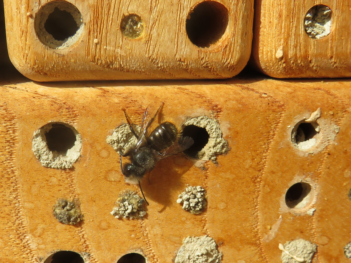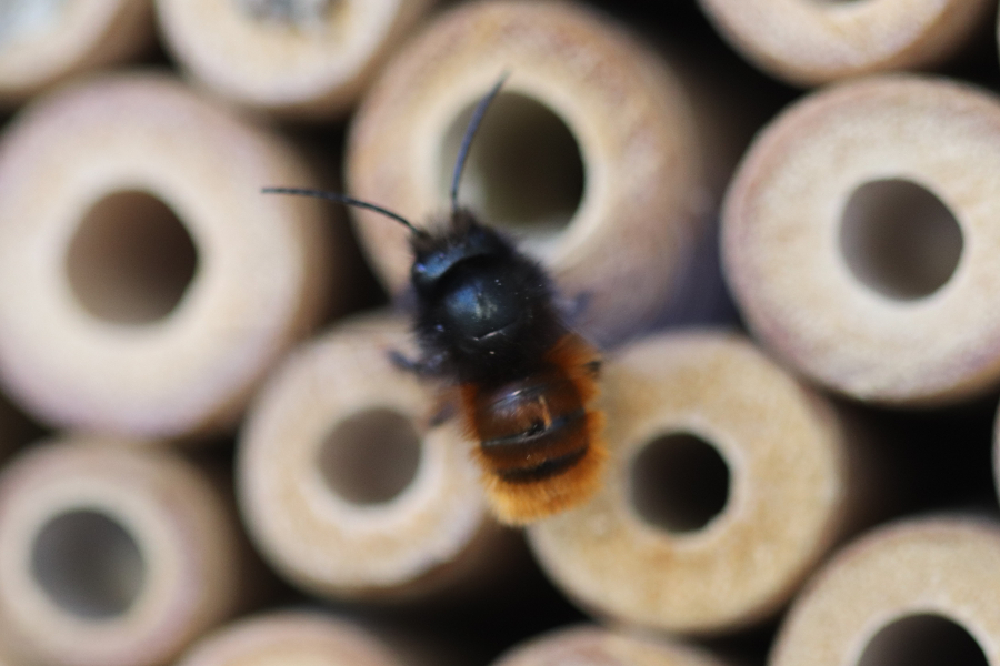 Den ersten Anklang hat das kleine Insektenhotel jedenfalls schon bekommen, keine viertel Stunde nachdem ich es aufgehangen hatte, kam die erste Mauerbiene vorbei. Ich muss allerdings dazu sagen, dass an der selben Wand bereits zwei Insektenhotels hängen, welche insbesondere von Mauerbienen angeflogen werden.