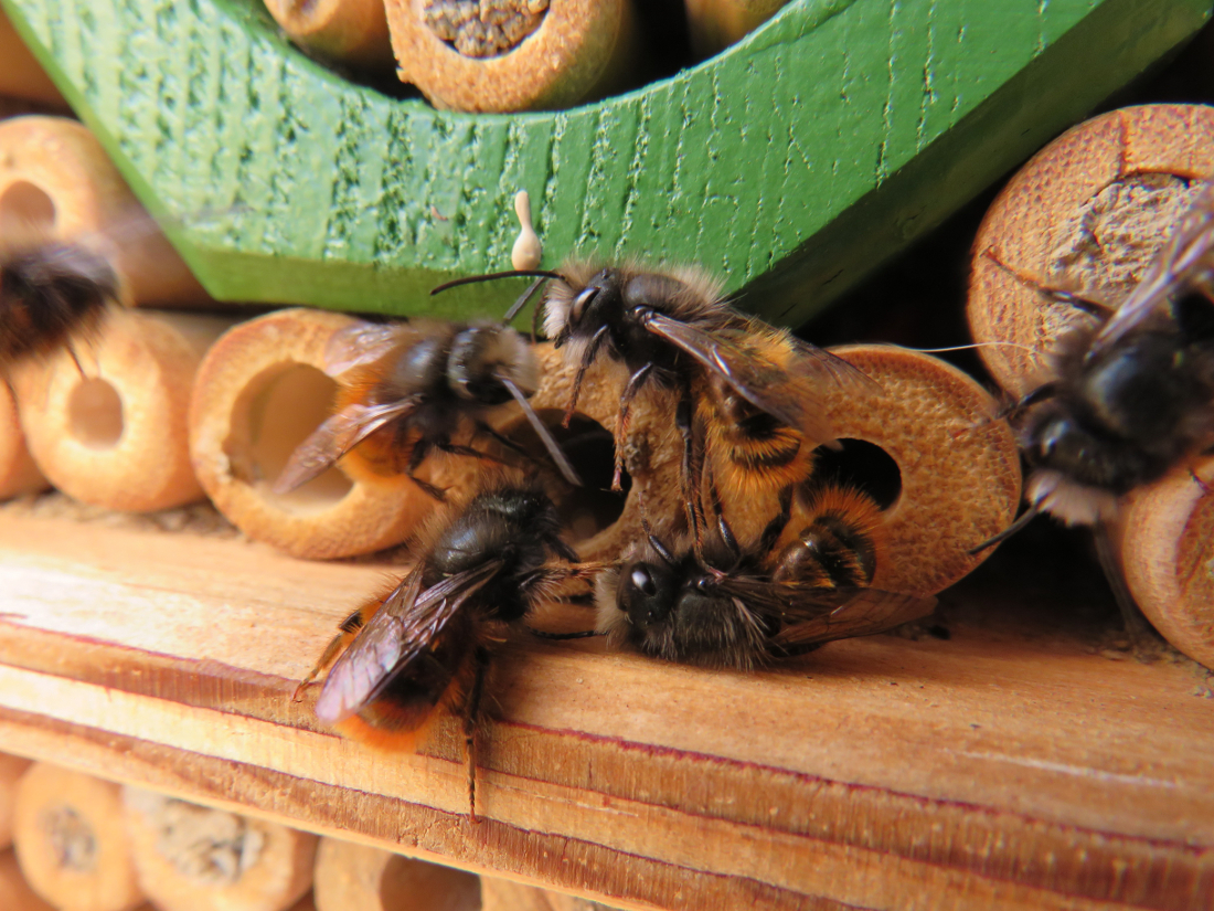 Die ersten Weibchen von Osmia cornuta haben begonnen Pollen zu sammeln und einzutragen, während sich die Männchen der Art vor den Nisthilfen rangeleien liefern.