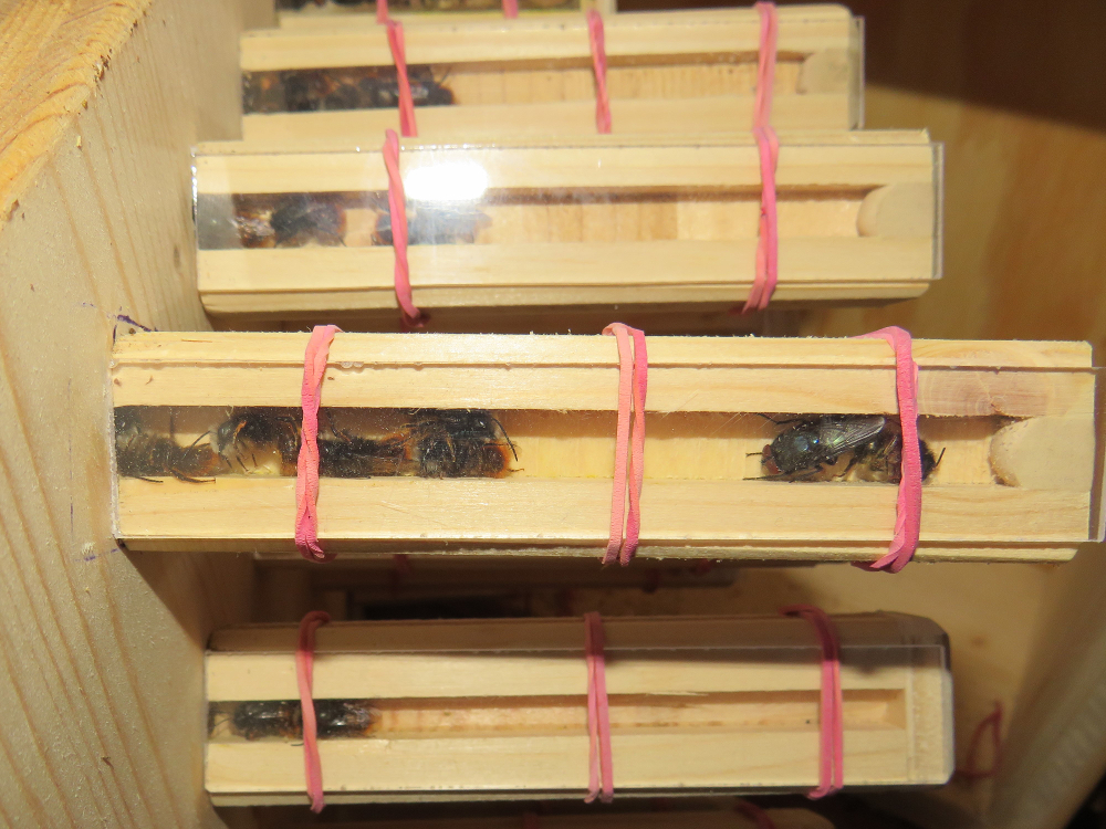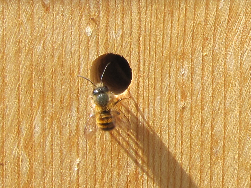 Es ist schon hinlänglich bekannt, wie wenig wählerisch die häufige Wildbiene Osmia cornuta bei der Nestwahl ist. Laut Literatur eignen sich alle vorhandenen Gänge in geeigneter Grösse. Etwa von anderen Bienen gegrabene Niststollen in Löss- und Lehmwänden, Käferfrassgänge in Holz, Bohrlöcher in Hauswänden, Abflussröhrchen in Fensterrahmen etc. Und der bevorzugte Durchmesser dieser Niststollen, liegt zwischen 7 mm und 9 mm Innendurchmesser. Nishilfen mit 8 mm-Bohrungen werden jedenfalls bei mir gerne und zuerst besiedelt.