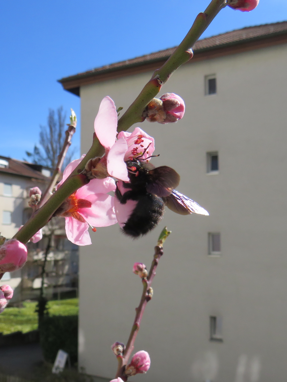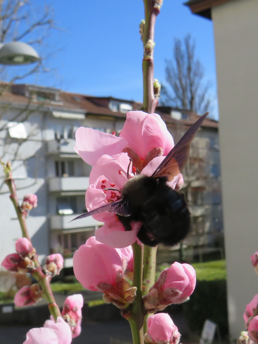 Die Mauerbienen - und natürlich vorallem die Blüten und Pflanzen wecken das Interesse von anderen Arten: Ab und zu schaut ein Männchen der Blauschwarzen Holzbiene Xylocopa sp. vorbei. Und am frühen Blütenangebot erfreuen sich auch weitere Arten: Hummelköniginnen und Furchenbienen der Gattung Lasioglossum. Daneben besuchen mich kleinere, schwarze Bienen. Nur leider gelang mir noch kein Foto und keine Bestimmung. Des weiteren sind natürlich diverse Schwebefliegen unterwegs. Und die Feldwespenköniginnen von Polistes dominula interessieren sich für den Honigtau der Blattläuse. Auch eine schwer bestimmbare grosse Schlupfwespe (Ichneumonidae ) ist schon aufgetaucht. Ihr seht, es ist ganz schön was los, auf meinem Stadtbalkon ;)