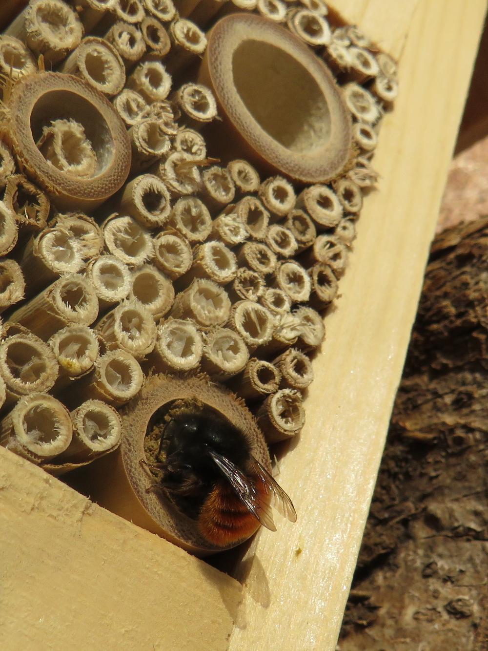 Von Zeit zu Zeit probiere ich neue Nisthifen aus, um die Produkte zu testen und um Parasiten vorzubeugen. Ich achte aber auch auf Vielfalt, damit sich unterschiedliche Arten ansiedeln können. Die Nisthilfe von der ich hier berichte stammt von einem Gelegenheitskauf aus einem Baumarkt. Ein sehr günstiges Modell und es ist noch zu untersuchen ob und wie brauchbar, weil es sichtlich Mängel aufweist. Die Tiefe der Röhrchen ist an der unteren Grenze und die Stängel sind nicht sauber geschnitten bzw. deren Kanten nicht abgeschliffen, drum teilweise ausgefranst. Manche der wenigen Halme schienen mir viel zu gross und wohl eher als gestalterisches Element eingebaut worden zu sein. Die Anderen aber aufgrund ihres geringen Durchmessers immerhin gut für kleine Arten - welche die Röhrchen allerdings teilweise ausfressen können müssen. Jedenfalls sicher nichts für die grossen, häufigen Osmia-Arten: Mit einem Durchmesser von ca. 15 mm dachte ich, sind die grossen Röhrchen für Osmia cornuta (und alle anderen Arten) viel zu weit, der Aufwand die Niststkammern abzutrennen und zu verschliessen für die Bienen viel zu gross. Und in die kleinen Halme von 2-6 mm Durchmesser passen die Weibchen sowieo nicht rein.