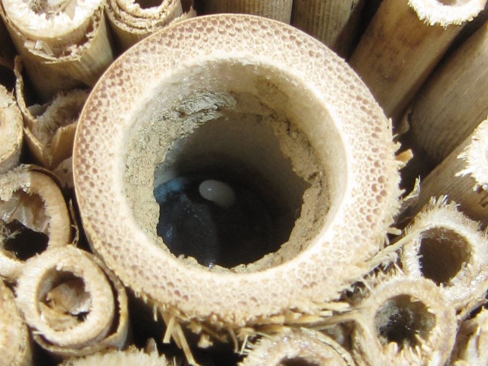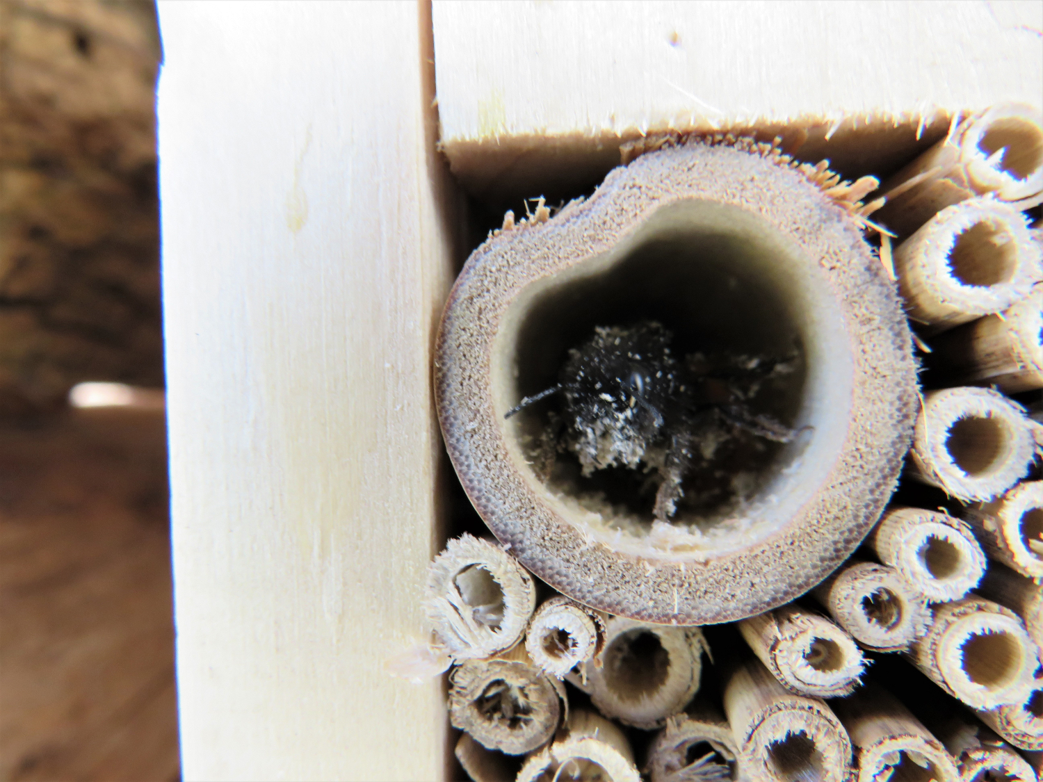 Ja, Osmia cornuta ist schnell mal mit einer Nistgelegenheit zufrieden. Es geht auch noch grösser als im vorherigen Beitrag. Diese Osmia cornuta hat sich entschieden, ein 20 mm Bohrung zu besiedeln...